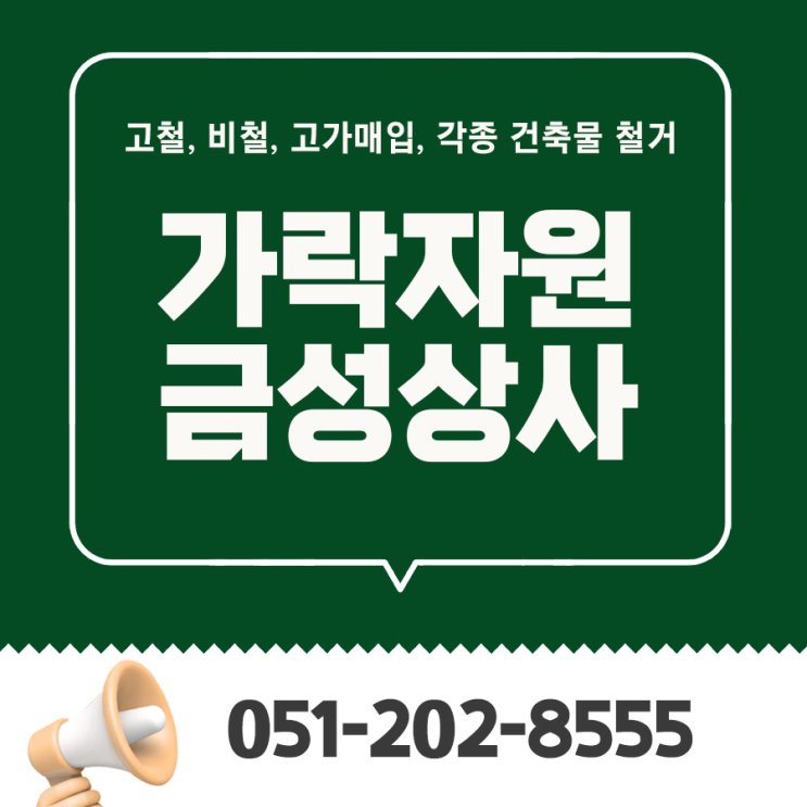 부산 가락자원(금성상사) ★ 문의 : 051-202-8555 ★ 주소 : 부산 사하구 동매로9번길 21 ★ 특징 : 고철, 비철, 고가매입, 각종 건축물 철거전문, 친절히 상담해 드립니다 주변을 정리하거나 공사 현장을 관리하다 보면 처치 곤란한 각종 금속 자재나 폐기물들이 쌓이기 마련입니다. 그냥 버리기에는 아깝고 어떻게 처리해야 할지 막막할 때 가장 먼저 떠오르는 곳이 바로 믿고 맡길 수 있는 자원 수집 업체입니다. 부산 사하구 동매로에 위치한 가락자원은 고철과 비철 매입은 물론 각종 건축물 철거까지 전문적으로 수행하며 지역 사회의 자원 순환을 돕는 곳입니다. 정직한 계량과 합리적인 매입 기준을 바탕으로 많은 이들이 찾는 장소입니....... <img src="https://blogthumb.pstatic.net/MjAyNjA0MThfMjUx/MDAxNzc2NDY5NDg2ODA0.ODid2UR1Jey9D3ycMb2hQEu68cEfCnXDYNQA94GVoVog.-EByqUVF9753Nl0k3irK6--Ryu5aBoBwIhQNdQ7gaUog.PNG/%B9%CC%BB%E7%BF%EB_%281%29.png?type=s3" />