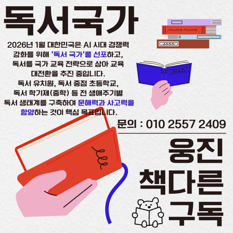 2026년 1월, 대한민국은 새로운 교육 패러다임을 선언했습니다. 바로 ‘독서 국가’입니다. 빠르게 변화하는 AI 시대 속에서 경쟁력을 갖추기 위한 핵심 전략으로, 독서를 중심에 둔 교육 대전환이 본격적으로 추진되고 있습니다. 왜 지금, 독서인가? AI와 자동화 기술이 발전할수록 단순 지식보다 이해력, 사고력, 문제 해결 능력이 더욱 중요해지고 있습니다. 이러한 역량을 가장 효과적으로 키울 수 있는 방법이 바로 독서입니다. 책을 읽는 과정은 단순한 정보 습득을 넘어, 깊이 있는 사고와 창의적 연결을 가능하게 합니다. 전 생애를 아우르는 독서 교육 이번 정책의 핵심은 특정 시기에 국한되지 않는 전 생애 독서 생태계 구....... <img src="https://blogthumb.pstatic.net/MjAyNjA0MjhfMTE2/MDAxNzc3MzgxNDY1MDc2.0NtfxiDCiqZVC79a2EiGpjygDgKYenx-PI4Z1z5Ea5Yg.Gdi-QkPgO3WKe2WW77AkNk1GiMY67-skYw6Mfq47tI8g.JPEG/1.jpg?type=s3" />