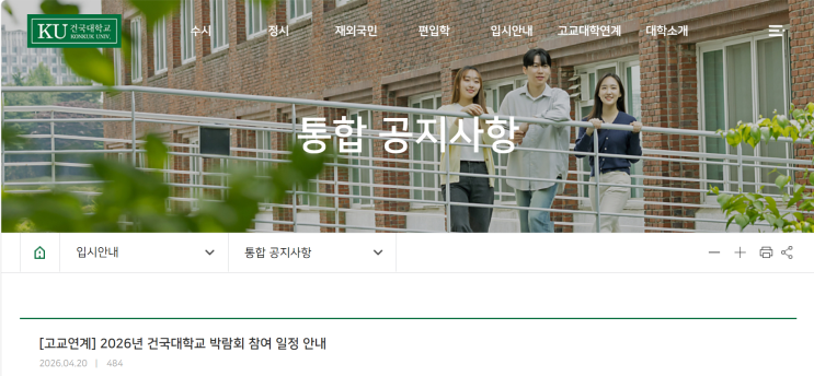[건국대학교 2026년 건국대학교 박람회 참여 일정 안내(2026.04.20) / 출처: 건국대학교 입학처 홈페이지 / 정리: 로스트럼 Y 학원]