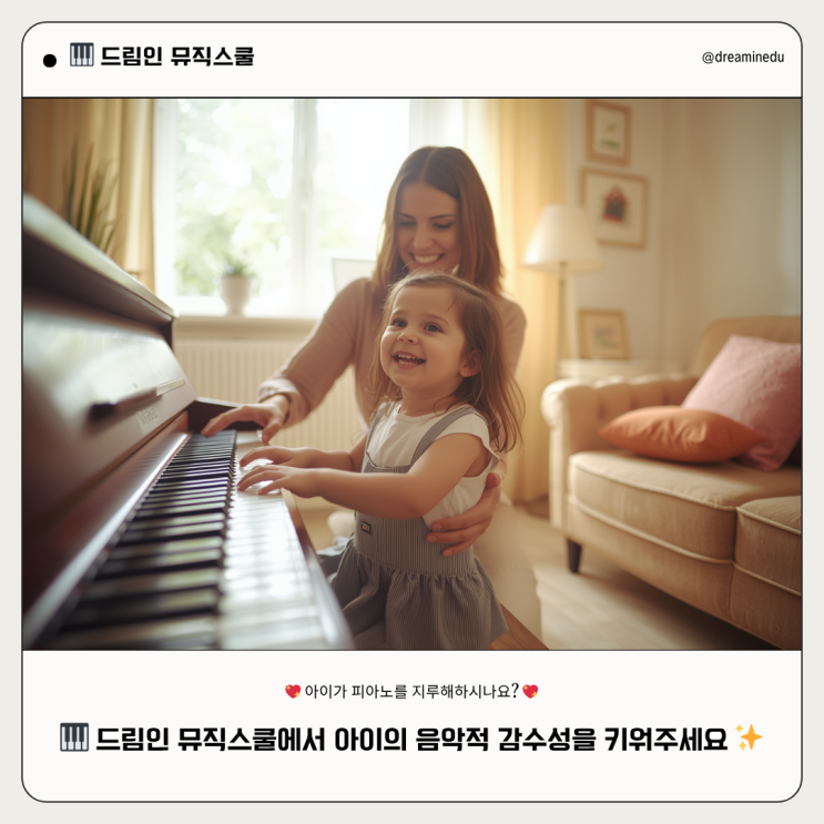 안녕하세요, 학부모님들! 혹시 우리 아이가 피아노 학원에 가는 것을 지루해하거나, 기계적으로 악보만 읽어내려가고 있지는 않은가요? 흥미를 잃고 억지로 하는 연습은 아이의 예술적 감수성을 닫게 만들고, 행여나 콩쿠르 같은 무대에서 위축되는 공포증을 유발할 수도 있답니다. 오늘은 아이들이 스스로 성취감을 느끼고 음악과 깊이 교감하게 만드는 드림인 뮤직스쿨만의 특별한 프리미엄 레슨 이야기를 들려드릴게요. ✨ 귀여운 진도카드와 스스로 적는 피드백의 마법 드림인 뮤직스쿨에서는 아이들이 피아노를 즐거운 놀이처럼 받아들일 수 있도록 귀여운 '진도카드'를 활용하고 있어요. 소나티네, 체르니 같은 뼈대가....... <img src="https://blogthumb.pstatic.net/MjAyNjA0MTdfMjAg/MDAxNzc2NDMxMTAzMzQy.ahxhmjurHbLLER_u7ZAihqoDNC6EHzWsqLBXXuwzFvQg.U9vPDrdIVaC-CaQSKL3r3sSMZ2zuzLC9cwQCS_Wq4kAg.PNG/%B5%E5%B8%B2%C0%CE_%C7%C7%BE%C6%B3%EB_%BD%BA%C6%A9%B5%F0%BF%C0_%C1%F1%B0%C5%BF%EE_%C0%BD%BE%C7%B0%A8%B0%A2_%C5%B0%BF%EC%B1%E2.png?type=s3" />