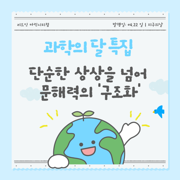 마린시티 초등 논술, 과학의 날 특집: 단순한 상상을 넘어 문해력의 '구조화'를 실현하다 안녕하세요. 해운대 마린시티의 교육 수준을 선도하는 프리미엄 독서 테라피, 리드인 마린시티점입니다. 최근 '과학의 날'을 맞아 학교마다 다양한 글쓰기 과제가 주어졌을 텐데요. 우리 아이가 쓴 글을 보며 "내용이 너무 단순한 건 아닐까?" 혹은 "상상력은 좋은데 논리가 부족해 보이네"라며 남모를 고민을 하셨던 학부모님들이 많으실 것 같습니다. 사실 초등 저학년 시기의 글쓰기는 단순히 '창의력'의 문제가 아닙니다. 읽은 정보를 자신의 언어로 소화하고, 이를 논리적인 문장으로 엮어내....... <img src="https://blogthumb.pstatic.net/MjAyNjA0MjBfMTEy/MDAxNzc2NjU0NjQ1MzMw.46fQFZaLtLVa0McfSu79HyAytq283LcUkRTMZOJs3D8g.AI980UGc6va2gKm9FMzszLIVrXwNh0OaGwaDYcYstp8g.PNG/1.png?type=s3" />