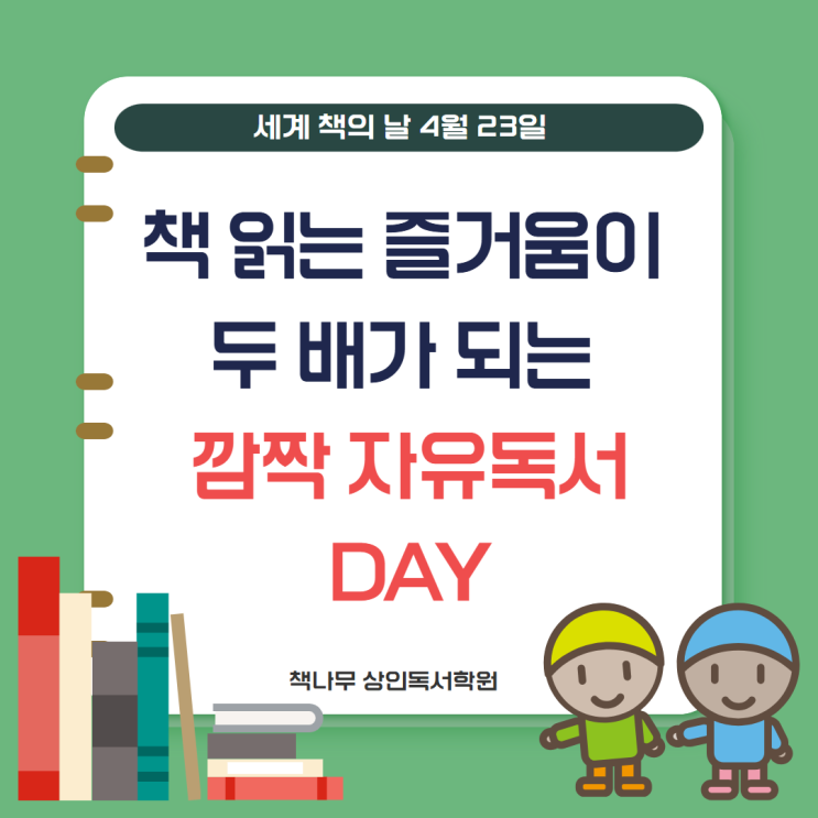 안녕하세요? 책나무 상인점입니다. 지난 주말은 본격적인 봄날씨가 시작되면서 동네마다 봄축제가 활짝 열리던 날이었습니다. 두근두근 책 속으로 4월 23일은 유네스코가 제정한 '세계 책의 날'입니다. 책나무 상인점은 주말에도 아이들이 책과 함께 했으면 하는 마음에 지난 토요일에 깜짝 자유독서DAY를 열었습니다. 보기만 해도 군침이 꿀꺽 넘어가는 떡볶이와 아이들의 독서하는 모습을 살짝 보여드리겠습니다. 매운 맛은 ZERO!! BUT 색깔은 맛깔스럽게 빠알갛게~ 빠알간 떡볶이가 부담스러운 친구는 달달한 짜장면으로~~ 먹고 싶은 대로 골라 먹는 재미있는 떡볶이 떡볶이는 언제 어디서나 먹어도 맛있는 음식이지만, 친구랑 삼삼....... <img src="https://blogthumb.pstatic.net/MjAyNjA0MjFfMjE1/MDAxNzc2NzQ3Mjc2NTQ4.RNnieyKaYrgnMoAUahDOjDjX3oS6QNAPHVJlf9WgzKcg.3TKTQMd5TlLebEe2Ue178rLgfPF5L8ifoVihwvi7zN4g.PNG/%BB%E7%BA%BB_-_%C1%A6%B8%F1%C0%BB_%C0%D4%B7%C2%C7%CF%BC%BC%BF%E4_%2834%29.png?type=s3" />