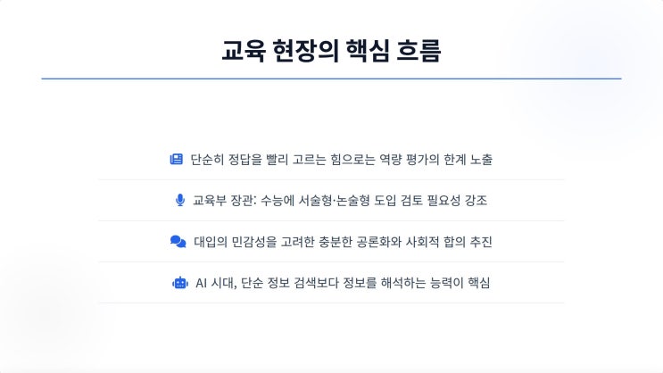 요즘 교육 기사들을 보다 보면 공통적으로 나오는 흐름이 하나 있습니다. 이제는 단순히 정답을 빨리 고르는 힘만으로 학생의 역량을 충분히 평가하기 어렵다는 이야기예요. 이번 한국일보 기사에서는 교육부 장관 인터뷰를 통해, 앞으로의 수능 평가가 서술형·논술형 방향까지 검토될 필요가 있다는 문제의식이 다시 강조됐습니다. 다만 대입은 워낙 민감한 사안인 만큼, 실제 도입 여부보다 먼저 충분한 공론화와 사회적 합의가 필요하다는 점도 함께 언급됐습니다. 이 기사의 핵심은 단순히 “수능에 논술이 들어가느냐”가 아닙니다. 더 중요한 건 AI 시대에 학생을 어떤 방식으로 평가해야 하느냐는 질문입니다. 이제는 정보를 찾는 것 자체....... <img src="https://blogthumb.pstatic.net/MjAyNjA0MjNfOTQg/MDAxNzc2OTMxNTIyNzI4.suZkmL4yflJAhTW9EoMA85wirRtz_m_m5Hc-EOmDcW0g.Ty9YneZeNE1MJ2th4YZp4Dp1Fuzbxbejzck4-4MdVyYg.JPEG/img-2.jpg?type=s3" />