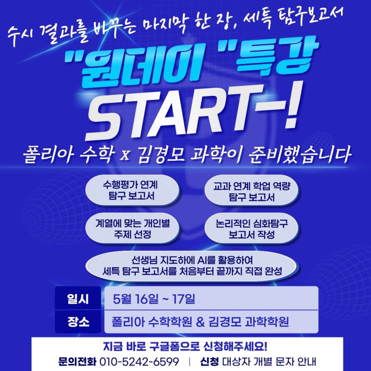 드디어 월성동 수학학원에서 준비했습니다 월성동 수학 폴리아 수학 월성동 과학 김경모 과학이 정말 힘들게 준비했습니다 무엇을 준비했을까요??? 학생들이 많이 힘들어하는 보고서 쓰는 방법을 특강으로 준비했습니다 누가?? 폴리아 수학학원 김경모 과학학원 이 준비를 했습니다 고교 학점제가 되면서 내신 부분의 등급이 5등급제로 바뀌었습니다 5등급제로 바뀌면서 탐구 보고서 정말 많이 중요해합니다 근데 학생들이 어디서 무엇을 어떻게 해야 되는지 잘 모르는 것 같아서 6월에 준비하면 시험 대비와 겹쳐 학생들이 많이 힘들어합니다 그래서 5월에 준비했습니다 고교학점제에서 탐구 보고서가 중요한지 대학 갈 때 알 수 있습니다 그때....... <img src="https://blogthumb.pstatic.net/MjAyNjA0MjdfMjgz/MDAxNzc3MjgzODQwMDgx.7sgF6JS0rrH-DjS-_xLQIUNBjEnGtCP2BV4pDOF81MMg.EPl63UtVIOE5kn592MOjC90ZG30X886hZvNHicsKkW0g.JPEG/KakaoTalk_20260427_185347298.jpg?type=s3" />