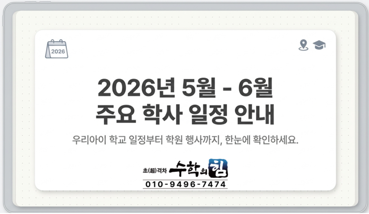 안녕하세요, 수학의힘 서창캠퍼스 원장 이수연입니다. 푸르른 5월, 가정의 달을 맞아 우리 아이들의 학습 흐름에 차질이 없도록 5월 전체와 6월 첫째 주 주요 일정을 먼저 안내해 드립니다. 원장이 드리는 5월의 편지: "생각하는 힘이 자라는 계절" 따스한 햇살만큼이나 우리 아이들의 웃음소리가 활기찬 5월입니다. 수학의힘 서창캠퍼스는 단순히 많은 문제를 푸는 것에 그치지 않고, 아이 스스로 문제의 본질을 꿰뚫는 '사고의 논리'를 세우는 데 집중하고 있습니다. 문제를 대하는 태도와 풀이 과정을 스스로 정리하는 습관이 잡힐 때, 비로소 수학은 '어려운 암기'가 아닌 '즐거운 이해'의 영....... <img src="https://blogthumb.pstatic.net/MjAyNjA0MjRfMjY3/MDAxNzc2OTU3MzA3MTM1.Ot6gUDqbEepdZATP75NSXDtNiGKDnqtzxoA1dvD9mkQg.nmiUyk-KkVi2f7yYei8CNB5eqwRpkfotuDHesdQohFIg.PNG/image.png?type=s3" />