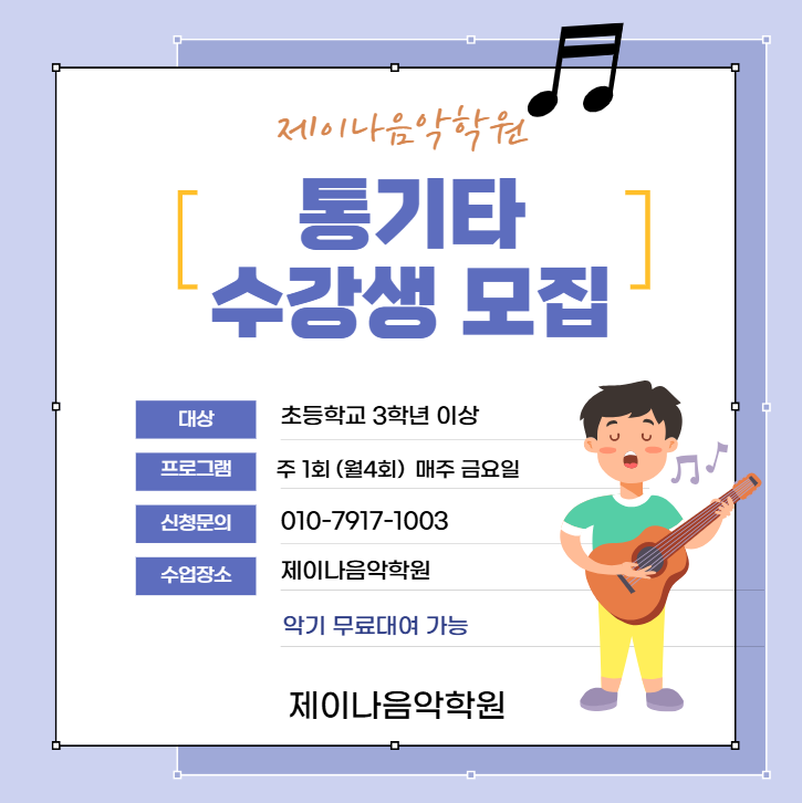등록번호 제 3793호 안녕하세요! 제이나음악학원입니다. 다양한 분야의 연주와 레슨활동을 하고계신 기타 전문강사 선생님을 모시어 기타 클래스를 신규개설 하였습니다!! 제이나음악학원 기타 클래스는 연령별 수준별 맞춤 커리큘럼으로 즐겁게 기타를 배울 수 있습니다. 많은 관심 부탁드립니다❤️ 교육문의 010-7917-1003 <img src="https://blogthumb.pstatic.net/MjAyNjA0MjdfMjU3/MDAxNzc3MjczNDI1MTU5.6xpWwOnv0mGskUJSH8vBveE8hyFWE4cMfw8bm1r5b5og.FNR3XC2gXwhPqC3JW-0wqdUnMa9XYZH2oRXpVspDypwg.PNG/image.png?type=s3" />