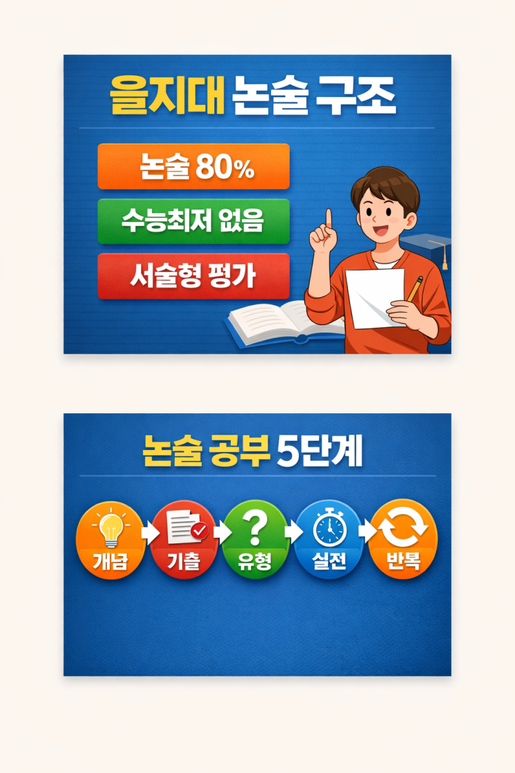 을지대 논술은 수능최저 없이 논술 중심으로 평가되며, 수학은 로그·삼각함수·수열·미분·연속 5가지 유형이 반복된다. 합격의 핵심은 계산이 아니라 풀이 과정과 논리적 서술 능력이다. 을지대 논술 구조 핵심 을지대학교 논술은 • 논술 80% • 학생부 20% • 수능 최저 없음 →즉, “논술이 전부인 전형”입니다 이 말은 곧 → 준비 방향만 맞으면 역전 가능 → 전략 없이 준비하면 탈락 이라는 뜻입니다 출제 구조 총정리 1) 국어 논술 특징 독해 + 개념 적용 논리적 서술 요구 요약 + 비교 + 적용형 문제 → 핵심: “읽고 쓰는 능력” 을지대 수학 논술 구조 / 수학 논술 5단계 2) 수학 논술 특징 전형적인 개념 문제 풀이 과정 중심 평가 계....... <img src="https://blogthumb.pstatic.net/MjAyNjA0MTdfOTAg/MDAxNzc2NDE3MTY0Njk3.DLta5BBoQ2iddgZgYQ1nTXJU7PvRtCXTcAHE5WRUuDQg.PwOf7N-_Tt_0LwkS7oM31MuOOZlyRQywE5SCunV4UYwg.PNG/%C0%BB%C1%F6%B4%EB%B3%ED%BC%FA%C0%CC%B9%CC%C1%F61.png?type=s3" />