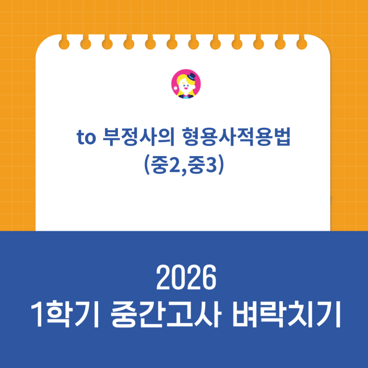 수쌤입니다 다음 주 중간고사를 앞두고 있습니다. 1회독… 다들 끝내셨죠? 이미 한 학생은 점검용으로, 아직 부족한 학생은 벼락치기용으로 오늘부터 수쌤과 함께 정리해봅니다. 중등 내신 영어는 교과서 본문 베이스! 본문은 오늘부터 1,2과 빈칸채우기 매일 반복하세요~ 자동으로 외워짐. 잘 하는 학생이든 못하는 학생이든 각 단원 핵심 문법은 기본개념 정확히. 오늘 벼락치기는, 중2 /중3 to 부정사 형용사적용법 1️⃣ to부정사의 형태 to + 동사 동사 앞에 to 붙으면 더 이상 동사 아님 -> 명사 / 형용사 / 부사 역할 (각각의 역할 구분 중요함) 2️⃣ to부정사의 역할 ✔명사로 쓰일때 ~하는 것 / ~하기 -To study English ....... <img src="https://blogthumb.pstatic.net/MjAyNjA0MjFfMTI1/MDAxNzc2NzQ2MzYxNjY1.8AhXdg_X88lhm3_3RNi8hMRx40eDKCbVaqPidyoMw60g.SDeZT5eh10kUxJdwbMLTU4V9BuXZWwnF6FBNrOsqdMQg.PNG/2026_%C1%DF%B0%A3%B0%ED%BB%E7_%BA%AD%B6%F4%C4%A1%B1%E2.png?type=s3" />