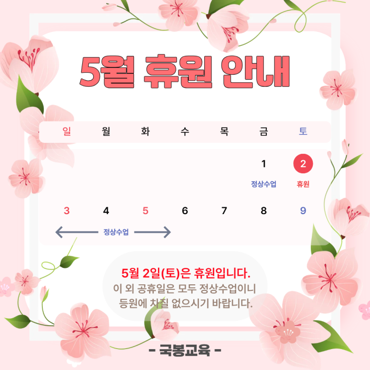 5월 2일(토)은 휴원입니다. 이 외 공휴일은 모두 정상수업입니다. 등원에 차질 없으시기 바랍니다. 언제나 학생들을 먼저 생각하는 국봉교육이 되겠습니다~ 감사합니다^^ <img src="https://blogthumb.pstatic.net/MjAyNjA0MjFfMjc2/MDAxNzc2Nzc4MjA1NDEw.v1Ngy5-leoTN6TGQRBzupYhQcuZMDJYdQ9JyoUO1Z2Ug.z_ygbzinlvTq5_tVTfeDNVOMHl437wVy7d4rZ2Ne048g.PNG/%C1%A6%B8%F1%C0%BB_%C0%D4%B7%C2%C7%D8%C1%D6%BC%BC%BF%E4..png?type=s3" />
