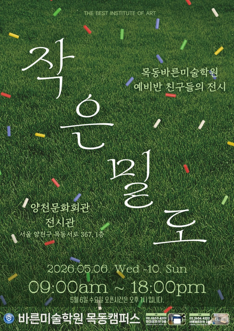 안녕하세요 바른미술학원 목동캠퍼스입니다. 따뜻한 봄바람이 기분 좋은 5월, 우리 목동 바른미술학원 예비반 친구들이 그동안 캔버스 위에 꾹꾹 눌러 담은 열정과 노력의 결실을 선보이는 자리를 마련했습니다. 바로 다음 주, 예비반 친구들의 풋풋하지만 진지한 작품들을 만나볼 수 있는 전시회, "작은 밀도" 가 열립니다. 아이들의 작은 터치 하나하나가 모여 얼마나 멋지고 밀도 있는 작품으로 완성되었는지, 그 감동적인 과정을 이번 전시를 통해 꼭 확인해 보세요!! 열심히 준비한 우리 아이들에게 가장 큰 선물은 여러분의 따뜻한 관심과 응원이랍니다. 바쁘시더라도 꼭 걸음해 주셔서, 이제 막 미술이라는 세상에 첫발을 내디....... <img src="https://blogthumb.pstatic.net/MjAyNjA0MjhfMTE2/MDAxNzc3MzYyMzEwNDA4.jxrQFY58WTv7svHU_buR3US96mPxBCk7zmbJFLngqrsg.DtKUj4_z4WumnRfEBd9qNG538-qU4nEQENdtLaYV-kYg.JPEG/KakaoTalk_20260428_155205547.jpg?type=s3" />