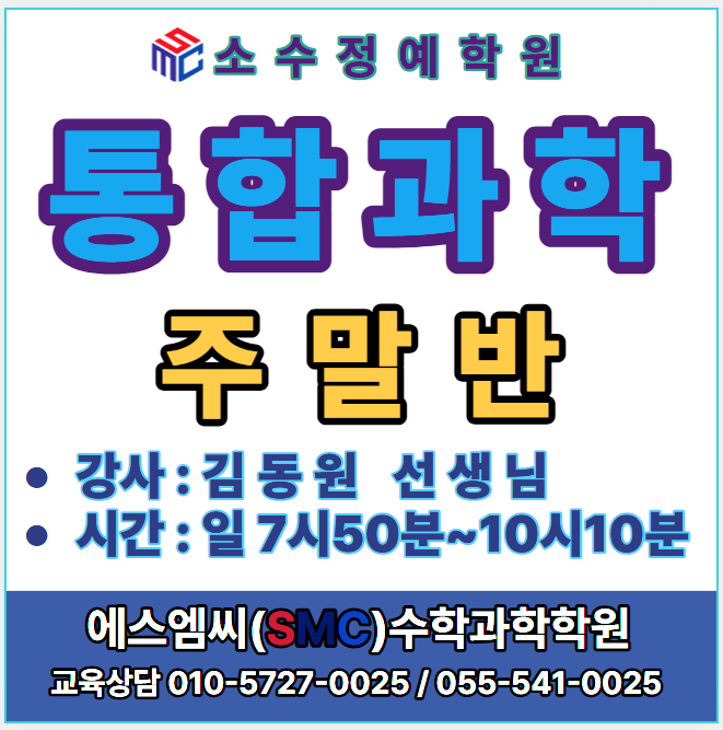 안녕하세요 에스엠씨(SMC)수학과학학원입니다. 오늘 저희 학원에서 통합과학 주말반 안내합니다. 통합과학에는 물리학, 생명과학, 화학, 지구과학의 내용이 모두포함되어 있어 통합과학이라는 과목을 어떻게 공부해야 하는지, 앞으로 치를 고등학교 시험이나 수능에서 새로운 유형의 문제를 계속해서 접할 것이기 때문에 지금부터 통합과학에 대한 자신감을 키워놔야 할 것입니다. 진로, 진학, 입시컨설팅이 포함된 학원! 1:1맞춤상담이 가능한 학원(사전예약필수)! 제대로 아는 전문가와 상담! 자세한 교육과정이 궁금하시다면 언제든지 학원으로 연락주시기 바랍니다. 통화가 어려운 경우 문자 남겨주시면 연락드리겠습니다. ex) 학교/학년/문....... <img src="https://blogthumb.pstatic.net/MjAyNjA0MjhfOTYg/MDAxNzc3MzY0NDc3NzAz.aK7Gx2whX7M7UTOVcqE5HsuJ_bESrZCklCvGqEXCtgAg._LygNuJ_87-mKdUHjgIDtRyZ3tc8R-v_8-BdZA4_N4Ag.PNG/image.png?type=s3" />