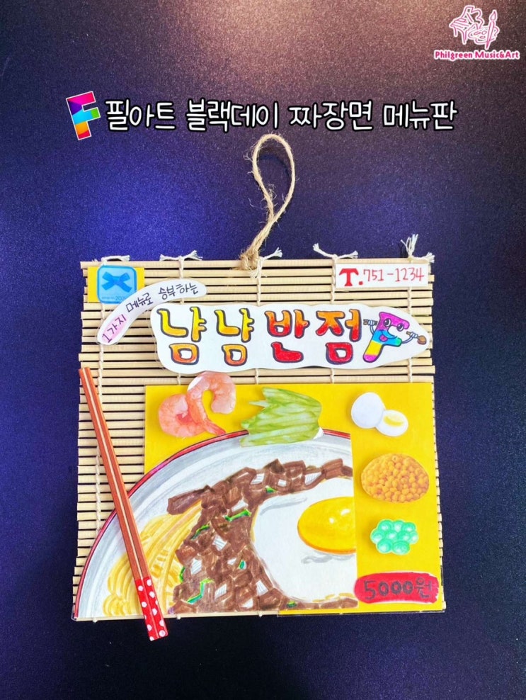 4월 셋째주 조형 프로그램 오늘은 내가 요리사짜장면 메뉴판 디자인 안녕하세용 이번 4월 셋째주 만들기 시간에는 푸드아트로 4월 14일 블랙데이를 기념하여 짜장면 가게 메뉴판을 구성하고 꾸며보는 활동을 진행했어용 필아트 친구들과 함께 블랙데이에 대해 이야기 나눠보며 짜장면 가게의 메뉴판을 직접 디자인해보는 시간을 가졌어요 ✨ 필아트친구들은 먼저 짜장면 그릇을 그리고, 면, 짜장 소스, 새우, 완두콩 등등 짜장면에 들어가는 다양한 재료들을 따로따로 정성껏 그려 색칠해 주었답니당 완성한 재료들은 벨크로(찍찍이)를 이용해 붙였다 떼었다 할 수 있도록 만들어 재....... <img src="https://blogthumb.pstatic.net/MjAyNjA0MjFfMTM3/MDAxNzc2NzE5NzI4MjA0.rMvRmVBUAs-GWKZemBBV3bB8rnXl8056Z7jvx1ZX2zgg.xqofTeEgNpAK3-UL-v_GeHG7wSUeOdZV348n0bGl6vwg.JPEG/IMG%A3%DF2376.JPG?type=s3" />