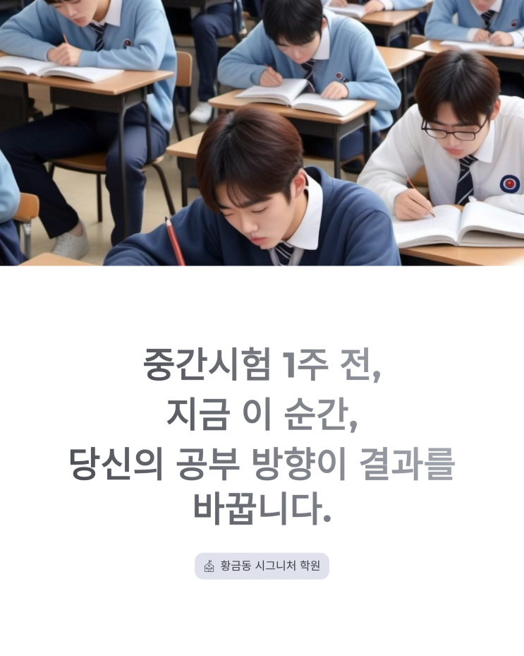 [수성구 황금동 학원] " 중간시험 1주 전,지금 이 순간,당신의 공부 방향이 결과를 바꿉니다. " 시그니처학원