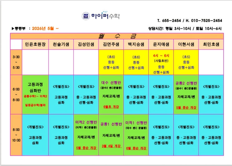 #사립초 수학 #삼육초 수학 #송원초 수학 #살레시오초 수학 #초등수학 #초6 선행 #초5 선행 단원별 성취도 시험에서의 높은 기준과 관리로, 결과에서 격차를 보여주는 하이퍼수학입니다 <하이퍼수학 초등반 신규 개강 안내> 안녕하세요, 하이퍼수학입니다. 5월부터 새로 개강하는 초등반에 대한 안내를 드립니다. 초중등과정은 선행+심화를 동시에 진행하며 빠른 진도를 위해 주 3회 수업을 원칙으로 운영됩니다. 기존 수업은 그대로 유지가 되며, 새로 개강하는 반에 대한 안내입니다 1. 화목 수업반 - 주말 수업시간을 내기 어려운 소수의 학생들을 위해 주2회만 수강 가능한 화목 초등반을 5월부터개강할 예정입니다. 화목에 집중적으로....... <img src="https://blogthumb.pstatic.net/MjAyNjA0MTNfOTYg/MDAxNzc2MDgyMzQyMTEw.SmoQakt_euwwooUm30AfUxeZ4aRO4nJFjmovEshwv_gg.urxSsEIkQ1HWR9RnJ7WPbTEYARzWZmQ64vycqV2K6UUg.JPEG/KakaoTalk_20260413_205103300.jpg?type=s3" />