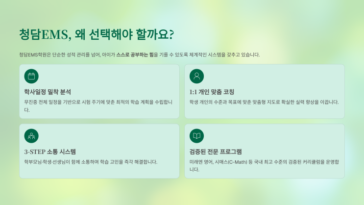 우리 아이들이 매일 열심히 공부하고 있지만, 정작 시험지와 오답들이 여기저기 흩어져 있어 복습에 어려움을 겪지는 않았나요? 아이들의 학습 효율을 200% 끌어올리고, 학부모님께는 투명한 성장을 보여드리기 위해 새로운 ‘밀착 관리 시스템’을 도입했습니다! ☝구멍 없는 학습: 내가 틀린 단어와 문법을 한 권에서 바로 확인하니 복습 시간이 단축됩니다. ✌누적 관리: 어제 틀린 문제를 오늘 또 틀리지 않도록, 체계적인 히스토리를 관리합니다. 매달 마지막 주 금요일, 아이의 손때가 묻은 단권화 노트를 집으로 보내드립니다. 노트를 함께 보시며 아이에게 따뜻한 칭찬과 격려를 한마디 건네주세요! 단순히 가르치는 것에 그치지....... <img src="https://blogthumb.pstatic.net/MjAyNjA0MTVfNTIg/MDAxNzc2MjM5MzkyNjY0.-Rzy6ZYvh6P8egv5Mj3Ns3uBgTlkJ828Sw79X1pbUDgg.4Msdr0cBe-Wt4BKhFGpFdiUJHULunpz5E6SE4Mvi8e8g.JPEG/IMG%A3%DF6083.jpg?type=s3" />