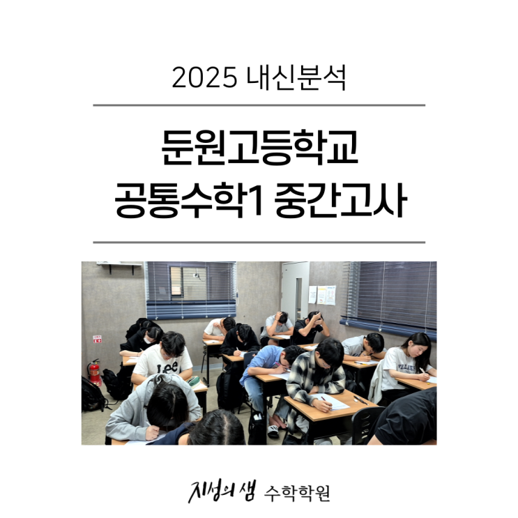 안녕하세요. 지성의샘 수학학원 월평점입니다. 이번 주부터 2026년 1학기 중간고사가 시작됩니다. 특히, 이번 주 금요일 둔원고등학교 1학년 공통수학1 시험이 예정되어 있습니다. 전년도 둔원고 공통수학1 중간고사 시험지를 보며 이번 시험을 예상하며 남은 기간 어떻게 대비하는 것이 좋은지 생각해보았습니다. 둔원고 시험이 근처 학교의 시험보다 어렵진 않습니다. 그렇다고 해서 마냥 쉬운 문제만 나오는 것이 아닌 모의고사 변형문제도 심심치않게 출제됩니다. 고득점을 얻기 위해 모의고사 유형의 변형 문제를 자주 다루어보고 유형 연습을 하는 것이 중요합니다. 이를 지성의샘 고득점의 비결(자체교재, 지고비)를 이용하여 학습하면 도....... <img src="https://blogthumb.pstatic.net/MjAyNjA0MjJfMjY1/MDAxNzc2ODM4MTEwNTAz.-G69HxDPQAIJ2jHGiXGAsXqVmlLwTFi-u1UHibZC6isg.m5A2J0pJc2usww_9mp64WhCL_8hhm2P6CVIVRagv4tkg.PNG/2025-%B5%D0%BF%F8%B0%ED1-1%C7%D0%B1%E2-%C1%DF%B0%A3%B0%ED%BB%E7-001_%282%29.png?type=s3" />