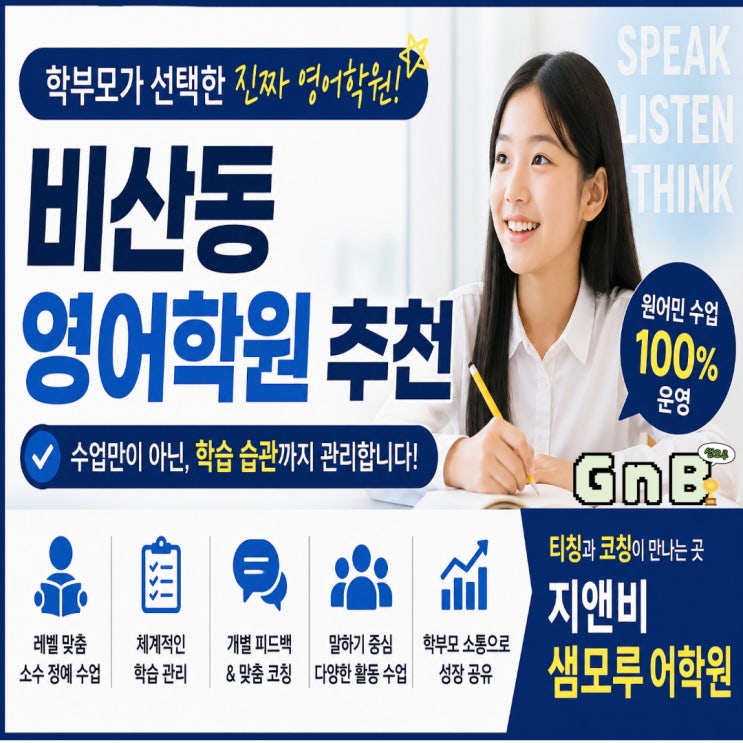 안녕하세요? 비산동 영어학원 추천 지앤비 샘모루 어학원입니다. 비산동에서 영어학원을 찾고 계신 학부모님들, 그리고 영어 공부 방향을 고민하는 학생분들이라면 단순히 “어디가 유명한가”보다 더 중요한 기준이 필요합니다. 특히 요즘은 문법 위주 학원, 문제풀이 중심 학원, 회화 중심 학원 등 선택지가 많기 때문에 더욱 신중한 판단이 필요합니다. 오늘은 비산동 영어학원 추천 기준과 함께 실제로 학부모들이 만족하는 학원의 핵심 요소를 구체적으로 정리해드리겠습니다. 지앤비 샘모루 어학원 왜 학부모님들이 선택할까? 1. 비산동 영어학원 추천 기준 ① “수업”이 아니라 “학습 구조”를 봐야 합니다 많은 분들이 “수업 잘하는 선....... <img src="https://blogthumb.pstatic.net/MjAyNjA0MjZfMjgw/MDAxNzc3MTY1NTc1MTg2.oP9XVHknGdlPpAB-7ehCbhUR0kl6gUvHjEdCURezqwIg.nNZJCv_3kKwPeYFw4XEMYGRtxxqWpLywJTNX3CC8QTAg.JPEG/%C1%A6%B8%F1%C0%BB_%C0%D4%B7%C2%C7%CF%BC%BC%BF%E4_%284%29.jpg?type=s3" />