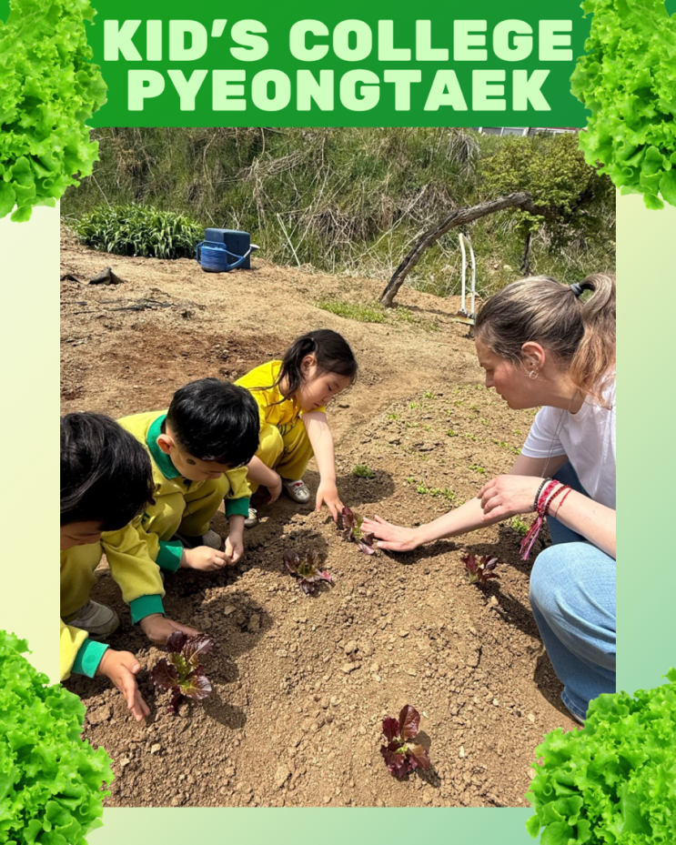 안녕하세요 키즈칼리지 평택입니다. 아이들과 함께 텃밭에서 상추 심기 활동을 진행했습니다 단순히 식물을 심는 체험이 아니라, 아이들이 직접 만지고 느끼며 배우는 경험 중심 수업으로 진행되었습니다. 흙을 만지고 모종을 심는 과정 속에서 아이들은 자연스럽게 식물이 자라기 위해 필요한 요소를 알아보았습니다. ✔ Air ✔ Water ✔ Light ✔ Soil ✔ Space 이 다섯 가지 요소를 단순히 ‘외우는 것’이 아니라 직접 경험하며 이해하는 시간이었습니다. 특히 활동 중에는 아이들이 자연스럽게 영어로 표현하는 모습도 볼 수 있었는데요 “Let’s cover it with soil!” “Let’s give it some water!” 이처럼 배운 문....... <img src="https://blogthumb.pstatic.net/MjAyNjA0MjFfMjE0/MDAxNzc2NzQwODE2OTcy.ud9bXpQZW9XDoqmCNIAUPFuJwa5nM6d7c-xLwfRJvM0g.FwGMPsHETFVDyh6-Y41rgN77dYisTvqrEmSBVvcBH1og.PNG/Green_And_White_Modern_Groceries_Catalog_Instagram_Post.png?type=s3" />