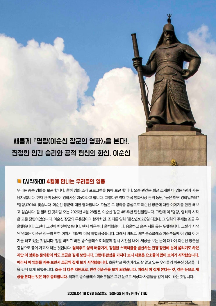 모바일로 보시는 분들은 하단으로 내려주시기 바랍니다. > 인쇄용은 상단 첨부파일을 다운로드하시기 바랍니다. > 댓글을 쓴 후, 하단 내 글 보관하기에 들어가서 보관해주세요. "SONGS Nifty Fifty for Song's Class" *학생용 글 입니다 -모바일- 2026.04.18 DYB 송오현의 ‘SONGS Nifty Fifty’ [16] 새롭게 『명량(이순신 장군의 영화)』을 본다!, 진정한 인간 승리와 공적 헌신의 화신, 이순신 [시작하며] 4월에 만나는 우리들의 영웅 우리는 종종 영화를 보곤 합니다. 흔히 영화 소개 프로그램을 통해 보곤 합니다. 요즘 관건은 최근 소개한 바 있는 『왕과 사는 남자』입니다. 현재 관객 동원이 영화사상 2등이....... <img src="https://blogthumb.pstatic.net/MjAyNjA0MTdfMTU3/MDAxNzc2Mzg3MzU0MTgw.6zkn5yDFbE7V4Dkhuk9sX646q4vCt8-BKgtFmrPSRkcg.Oomg1riD67M-kAHtOdluiigBaFppwB7EN-ajeiLx-OMg.JPEG/20260418_%C0%CC%BC%F8%BD%C5-%BE%D0%C3%E0%B5%CA_1.jpg?type=s3" />