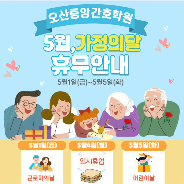 안녕하세요 오산중앙간호학원입니다. 2026년 새해를 시작한게 엊그제 같은데.. 벌써 4월이 끝나 가고 있어요 ^^ 시간이 참 빠르네요 그만큼 상반기를 열심히 살아왔다는 뜻이겠죠? 간호조무사를 시작하시고 공부하느라, 실습하느라 가정과 가족에게 소홀하셨을 거예요 ㅜㅜ 그래서 저희 오산중앙간호학원은 5월 가정의 달을 맞아 연휴로 잠시 쉬어갑니다^^ 짧은 연휴지만 사랑하는 가족과 함께 편안한 시간을 보내며 충전의 쉼이 있기를 바래요~^^ 하지만!! 상담전화는 휴일 없이 쭈~~욱 가능합니다^^ 혹시 간호조무사에 관심 있으신가요? 저희 오산중앙간호학원에서는 26년 상반기 5월 12일 약 9개월 속성반을 모집중입니다. 전화주세요~ 내일배....... <img src="https://blogthumb.pstatic.net/MjAyNjA0MjhfODIg/MDAxNzc3MzQwMjE3OTc4.yKmzPjMwkko_M6aFBFdcs-yrdM2eQAt_8O8jAz-XYLgg.y7OGgCyQY0qo2Vh3gZtdeuJkPXiArw69LV40ypJn9hEg.PNG/image.png?type=s3" />