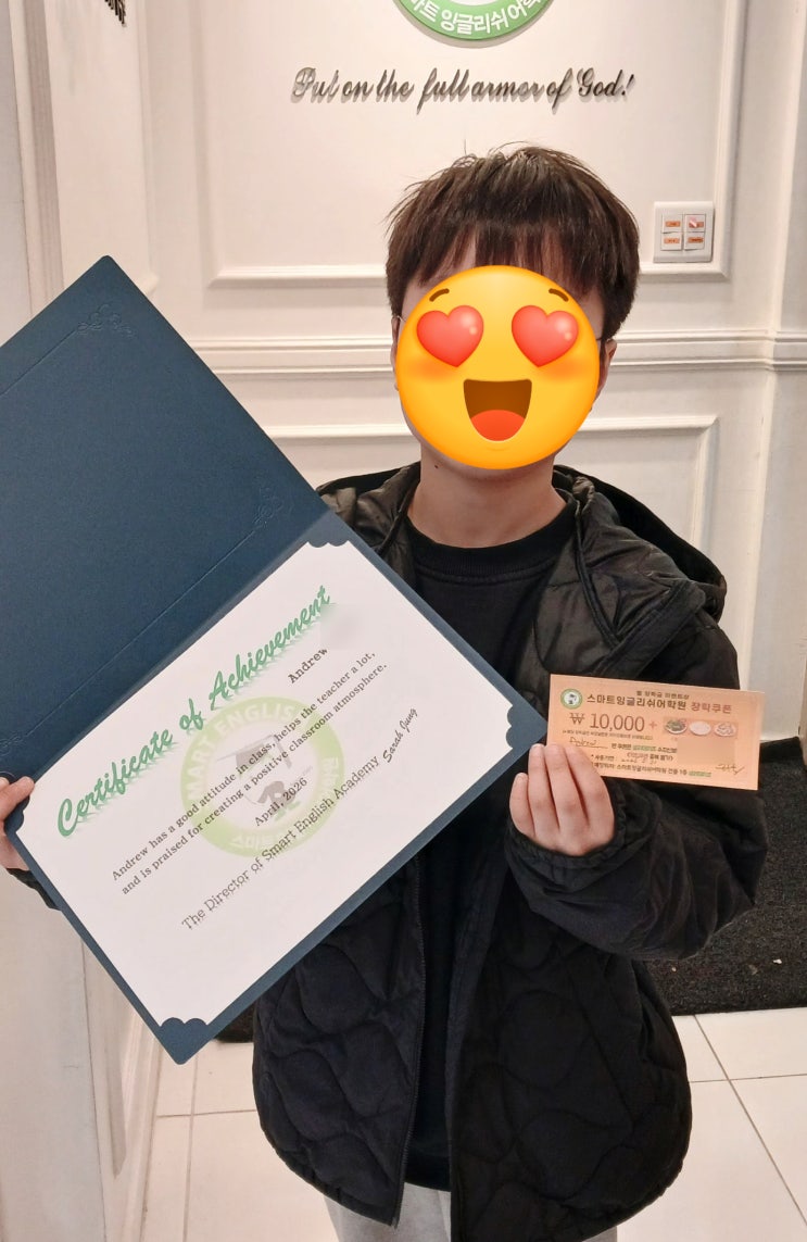 안녕하세요 ✨ 아이들의 자신감 넘치는 영어 학습을 이끄는 성복초 영어 스마트 잉글리쉬 어학원입니다! 오늘은 우리 스마트 친구들의 기쁜 장학금 소식을 전해드릴게요~! 아이들의 노력과 성장이 ✨ 반짝반짝 빛났던 순간들! 지금 바로 함께 보시죠 바른수업태도상 수상자 먼저 소개해 드릴 친구는 바로! Andrew 선생님을 잘 도와주고 수업에도 적극적으로 참여하며 ♂️ 항상 성실한 태도로 학원 생활을 한 친구에게 주어지는 상이에요! 꾸준한 태도의 힘을 보여준 Andrew! 정말 멋지고, 큰 박수를 보냅니다 다음으로는 ✨ 영어원서 다독상 ! 다음은 무려 ?....... <img src="https://blogthumb.pstatic.net/MjAyNjA0MjNfMjcy/MDAxNzc2OTM3ODU0MTg2.mfa45TOAz73jjG1AHNPKPtHDJDNFC7_YBNUz_Tas9ycg.TDDIvEIzDBdTEWxsstNaUwBz9juntuJwQQEbV1MiREkg.JPEG/KakaoTalk_20260413_143710594_01.jpg?type=s3" />