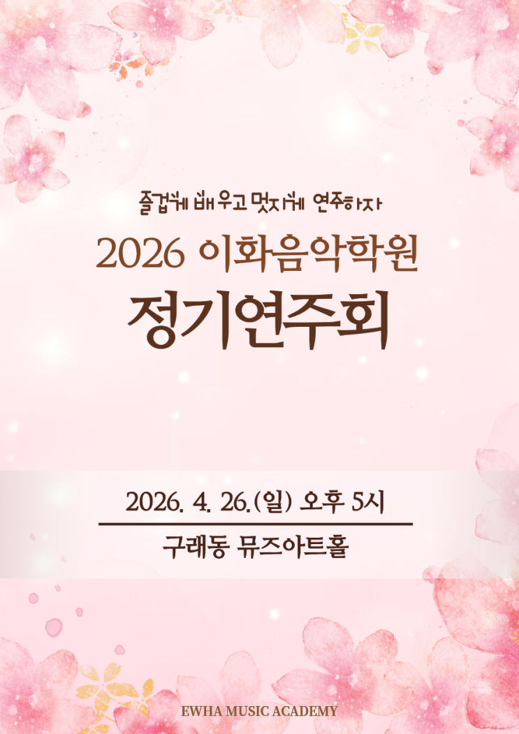안녕하세요 김포시 운양동에 위치한 이화음악학원입니다. 오늘은 정말 신나는 날이예요. 그동안 갈고닦은 실력을 부모님과 친구들에게 자랑하는 날이예요. 짠~~ 기다리던 연주회날이네요. 다양한 프로그램으로 음악을 즐기며 멋지게 연주하는 우리의 공연을 봐 주세요. 오늘의 준비물은 박수와 환호입니다.^^ 즐겁게 배우고 멋지게 연주하는 이화음악학원입니다! 010-5959-2204 #운양동피아노 #하늘빛초피아노 #청수초피아노 <img src="https://blogthumb.pstatic.net/MjAyNjA0MjZfMTMg/MDAxNzc3MTUxODcyMDI1.1TACur5v45A1qCEIB3KRGTMwQFT9jd_WnPJXWoPGrdwg.Awcn20gZaZMG0DCAFQGG8MD10IMz31xRBYjJd8rYinEg.PNG/1776865985666.png?type=s3" />