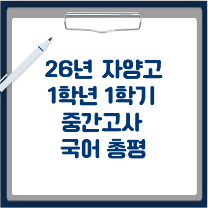 2026학년도 자양고등학교 1학년 1학기 중간고사 총평 1. 전체적인 출제 경향 및 난이도 분석 이번 중간고사는 총 26개의 객관식 문항으로 구성되었으며, 전체적인 난이도는 작년과 비슷한 '중상' 정도를 유지했습니다. 기초를 튼튼히 다진 학생들이 풀 수 있는 15문항과 실력을 가늠하는 고난도 11문항이 조화롭게 출제되었습니다. 다만, 작년보다 변별력을 요하는 문항이 다소 늘어나면서 우리 중위권 학생들이 느끼는 심리적 압박감과 부담이 작년보다 컸을 것으로 생각됩니다. 2. 문제 구성 및 영역별 난이도 이번 시험은 지난 학기와 달리 영역별 문항 수에 유의미한 변화가 있었습니다. 이전에는 문학과 문법의 비중이 동일했으나....... <img src="https://blogthumb.pstatic.net/MjAyNjA0MjNfMjcx/MDAxNzc2OTM5MjI0NDIw.YcZH-bcsgS00PgDf2Cn8rn5CE_MWJ2SLXMqhZVf0Fykg.ki-ExsaPMP-mesHqLWvlC6LAxr1UI--NJrpBL0Y_Zzcg.PNG/image.png?type=s3" />