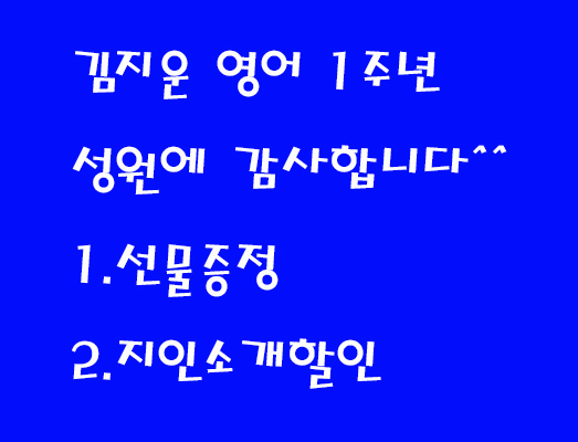 안녕하세요, 김지운 영어입니다.^^ 저희 김지운 영어는 2025년 5월에 개원하여, 학부모님들의 따뜻한 성원과 응원 속에 어느덧 1주년을 맞이하게 되었습니다. 지난 1년 동안 믿고 소중한 아이들을 보내주신 마음과 늘 변함없이 응원해주신 덕분에 오늘의 김지운 영어가 있을 수 있었습니다. 진심으로 감사드립니다. 감사의 마음을 담아 개원 1주년 기념품을 준비하여 수강생 전원에게 전달하였습니다. 작은 선물이지만 아이들에게도 기분 좋은 추억이 되었으면 합니다. 또한 개원 1주년을 기념하여 5월 한 달 동안 소개 할인 이벤트를 진행합니다. 주변 학생을 소개해주시고, 소개받은 학생이 5월 중 등록을 완료한 후 실제 수강을 시작할 경우, ....... <img src="https://blogthumb.pstatic.net/MjAyNjA0MjFfMTg3/MDAxNzc2NzUzMzA0NjMz.NdStWwUQMVlvRbIS54hDSox_mAb3dNrxvft2jVhdmtsg.jEVefgd2beOe_TWVNqRHLn46dDnRUplAO2w8rSfspikg.JPEG/1%C1%D6%B3%E2.jpg?type=s3" />