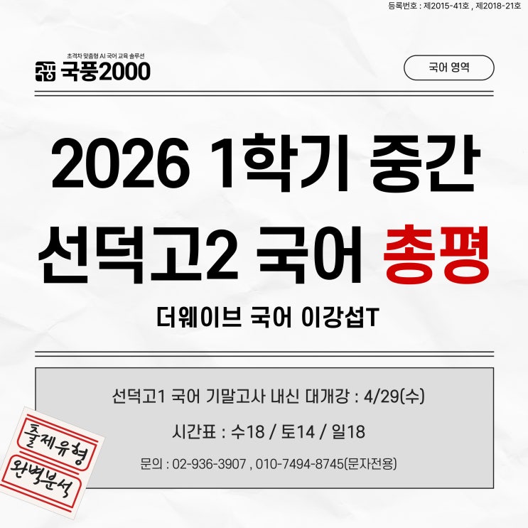 안녕하세요, 국풍 더웨이브 이강섭입니다. 오늘 실시된 선덕고 2학년 문학 중간고사는 평소 선덕고시험에 비해 평이한 난도로 출제되었습니다. 현재 만점자가 4명 내외로 추산될 만큼 변별력이 낮아, 1등급 커트라인은 객관식 2개 오답 기준인 93.2점 내외에서 형성될 것이라 학교선생님의 메시지가 있었습니다. 다만 전체적인 난도가 낮았던 만큼 실제 등급컷은 이보다 조금 더 높게 형성될 가능성도 충분히 존재합니다. 국풍 더웨이브 현재 93점 이상인 학생만 23명에 달하며, 이는 전체 선덕고 2학년 1등급 36명중 63.8%입니다. 또한 전 학기 대비 20점이상 상승자는 5명입니다. 시험이 수월하게 느껴졌다는 아이들의 피드백은 우리가 평소 실....... <img src="https://blogthumb.pstatic.net/MjAyNjA0MjNfMjcz/MDAxNzc2OTIyNjkwODMw.-ZrXZZzxrU1RePyXIpvENLB4b9kcmgtlqsqtLBpMY2og.DWzTY5sFioNCknfJompAMV1Fth3skAqL6YebLn5uwMog.JPEG/%C1%DF%B0%E8%B0%FC-%C3%D1%C6%F2-%BD%E6%B3%D7%C0%CF1-001_%281%29.jpg?type=s3" />