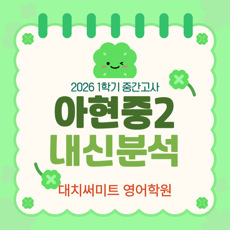 안녕하세요. 아현중 영어 내신 전문 학원 대치써미트 영어학원입니다. 아현중학교는 4월 29일(수) ~ 4월 30일(목) 이틀에 걸쳐 1학기 중간고사를 실시하였고, 영어는 첫 날인 29일에 실시하였습니다. 마포 입시 영어의 중심 대치써미트에서 준비한 2학년 1학기 중간고사 분석을 통해서, 2026학년도 남은 시험은 더 계획적이고, 체계적으로 준비하기를 바랍니다. 아현중 2학년 1학기 중간고사 특징 선택형 30문제, 총 100점으로 전 문항 객관식으로 출제되었습니다. 단순 암기형이 아닌 '본문 통합 이해 + 어법 운용력' 중심의 응용형 시험이었습니다. 본문 영역에서는 동아(윤) 1-2과 지문이 모두 활용되었으며, 본문 안에 ■~■·■~■....... <img src="https://blogthumb.pstatic.net/MjAyNjA0MzBfOTQg/MDAxNzc3NTMwMjEwNzU4.CqYfMqqa-8NnrQOWinBqXc1_m-qvh4jfin6CzJAFgs4g.NS5CtlegeSQnRuj6oTy3UQKSaRGDijYcCiYP9NtspiUg.PNG/1.png?type=s3" />