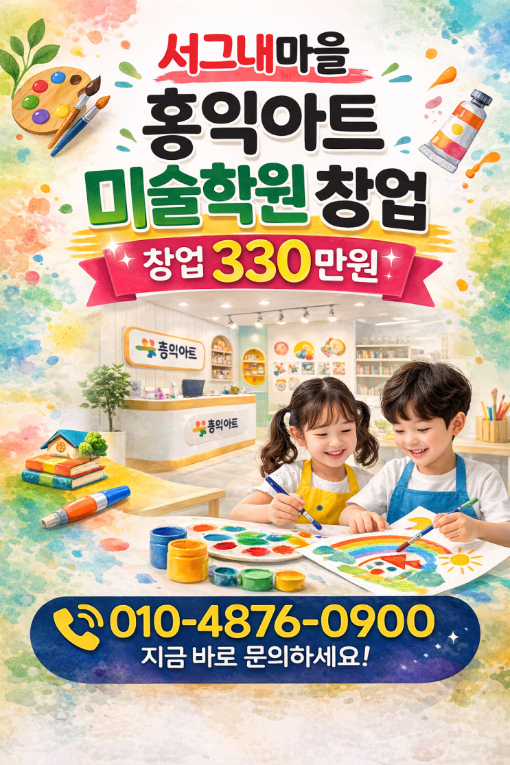 서그내마을용인서천아이파크아파트 미술학원 창업 용인 기흥구 서천동 학군 미술교육 – 홍익아트 미술교육원 가맹비 330만원 용인 기흥구 서천동은 수원 영통 생활권과 가까운 주거지역으로 교육 환경과 생활 인프라가 잘 형성된 지역입니다. 특히 서그내마을용인서천아이파크아파트 주변은 어린 자녀를 둔 가정이 많은 단지로 방과 후 교육과 창의미술 교육 수요가 꾸준한 지역입니다. 서천동은 영통·망포 생활권과 인접해 있어 유아 미술교육, 초등 창의미술, 드로잉 기초 교육 등 다양한 방과 후 교육 프로그램에 대한 학부모 관심이 높은 특징이 있습니다. 이러한 환경에서는 미술교습소나 소형 미술학원 창업이 안정적인 교육 창업 모델로....... <img src="https://blogthumb.pstatic.net/MjAyNjA0MjVfMTY1/MDAxNzc3MDc2MzU0NDk3.C8UvdJfBbr6ToqSgXG7c4oOTJYZfEMiEhdg67Pb3heYg.NZ-M0-nEZbvaZzsKKywB-yCo72luxjgPQ8X4AggGSSkg.PNG/%BC%AD%B1%D7%B3%BB%C3%A2%BE%F71.png?type=s3" />