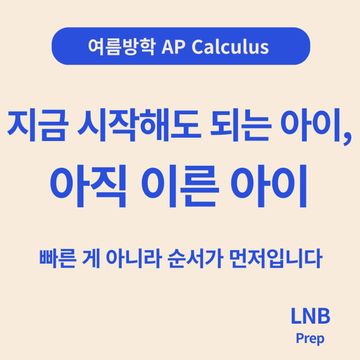 여름방학 AP Calculus 선행은 빨리 시작한다고 무조건 유리해지지 않습니다. 순서를 잘못 잡으면 진도는 나갔는데 가을 학기 GPA와 수학 자신감이 같이 흔들릴 수 있습니다. 이맘때가 되면 비슷한 말씀을 많이 하십니다. "여름방학에 AP Calculus AB나 BC를 미리 해두는 게 좋을까요?" "수학은 빨리 빼놓을수록 유리한 거 아닌가요?" " 지금 안 하면 나중에 늦는 건 아닐까요?" 이 질문이 어려운 건 정보가 없어서가 아닙니다. 여름방학은 길지 않고, STEM을 생각하면 수학 선행이 중요하다는 말도 이미 많이 보셨을 겁니다. 문제는 그다음입니다. 그래서 지금 우리 아이에게 필요한 게 AP Calculus 선행인지, Pre....... <img src="https://blogthumb.pstatic.net/MjAyNjA0MDlfMjg3/MDAxNzc1NzE4NjQxNDg5.152rULEpdLjbM5YEIL0SuGFtAPGfREH8mVZ_Wjj5xvAg.2_jgOHcjiDNOZBPuUgEtdD02x0ACNoaIMikfz1eUk-wg.PNG/%C1%FA%B9%AE%C7%FC_%C7%D9%BD%C9%B1%E2%C1%D8_%284%29.png?type=s3" />