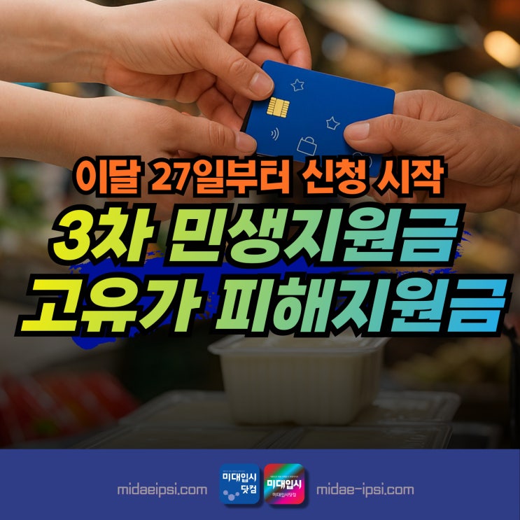 안녕하세요~ 미대입시닷컴 에디터입니다! 오늘은 3차 민생지원금에 관한 포스팅을 진행하도록 하겠습니다~ 행정안전부는 이달 27일 고유가 피해지원금 신청 및 지급이 시작됨에 따라, 지방자치단체의 차질 없는 준비를 위해 전국 226개 시·군·구 부단체장 회의를 개최했다고 합니다. 행안부는 지방정부의 지급 준비상황을 점검하고, 신청·지급이 원활하게 이뤄질 수 있도록 부단체장 중심의 적극적인 역할과 준비를 당부했습니다. 특히 선불카드와 지역사랑상품권(지류형) 등 오프라인 지급수단의 수요를 사전에 예측해 충분한 물량을 확보하고, 카드 디자인 등을 통해 취약계층 여부가 드러나지 않도록 세심한 관리가 필요하다고 강조했습니다. ....... <img src="https://blogthumb.pstatic.net/MjAyNjA0MjJfMTIx/MDAxNzc2ODQ5NzYxODIy.HThTJkwUj_xS_zFNkKq23XSF3gxGK49xEIev4QfTZrEg.IAYNQJq2IIBQZ4SQoOSI6Fp8cH1bdTGwl1uvymAEn_Mg.JPEG/001.jpg?type=s3" />
