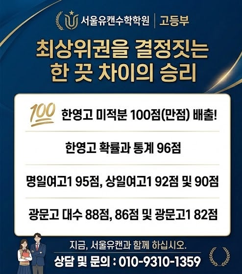 2026년 1학기 중간고사 압도적 성적 공개 결과로 증명하는 유캔의 저력! 안녕하세요, 명일동 학생들의 수학 자신감을 책임지는 서울유캔수학학원입니다. 새 학기의 설렘이 채 가시기도 전에 치러진 2026학년도 1학기 중간고사. 유난히 까다로웠던 출제 경향 속에서도 우리 서울유캔수학 학생들은 흔들림 없이 각자의 위치에서 최고의 결과를 만들어냈습니다. 밤늦게까지 학원을 지키며 오답과 사투를 벌였던 아이들의 노력이 '압도적 성적'이라는 열매를 맺게 되어 대견하고 기쁜 마음입니다. 고등부 "최상위권을 결정짓는 한 끗 차이의 승리" 고등부 수학은 단순한 개념 이해를 넘어 고난도 킬러 문항을 제한 시간 내에 해....... <img src="https://blogthumb.pstatic.net/MjAyNjA0MzBfMjI1/MDAxNzc3NTAzNTkyMjM0.P9kELNiJqVjsHO6IYlxrx1IYR76ldraz988Sn9JqZNog.1NAEjB8NfeHZGMcm79YKtvwHM8LOlqK_oxGYwMU_sBMg.JPEG/a8c51d60-bfa1-47f6-9e6a-81bfde0882b8.jpg?type=s3" />