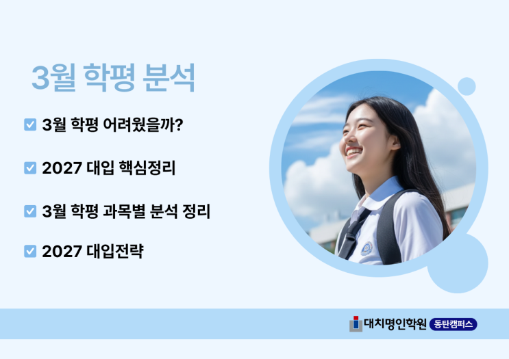 3월 학평, 생각보다 어려웠나요? 3월 학평 이후 학생들과 학부모 상담을 진행해 보면 가장 많이 나오는 말이 있습니다. "문제가 어려웠다기보다 시간이 부족했어요!" "지문이 길고 생각할게 많았어요!" 이 말은 매우 중요한 의미를 가지도 있습니다. 현재 수능 출제방향이 바뀌고 있다는 신호이기 때문입니다. 이제는 단순히 문제 난이도가 아니라 풀이과정이 어려운 시험으로 변화하고 있습니다. 2027 대입 변화 핵심정리 가장 큰 변화 3가지 1️⃣ 학평 응시 인원 감소 경쟁구조 변화 학령인구 감소로 인해 학평 응시 인원은 약 41만명 수준으로 감소 상위권 경쟁은 더 치열해지고, 중위권 등급변동은 더 커진다....... <img src="https://blogthumb.pstatic.net/MjAyNjA0MDZfNDUg/MDAxNzc1NDU5MjU4MzQ0.UwtI6h8Z0mcKU_RqWszo4yTR7tDfLiwvQI-ZGZwrAc0g.hjTYDSq2AE3Lygq2plEzbhtjz7DNpWUK5CTr-3c6zRIg.PNG/%C1%A6%B8%F1%C0%BB_%C0%D4%B7%C2%C7%D8%C1%D6%BC%BC%BF%E4._%283%29.png?type=s3" />