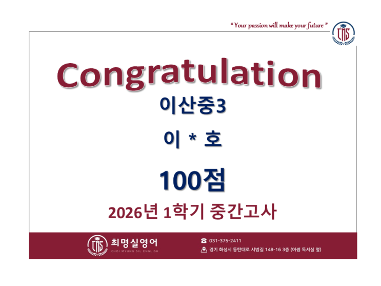 2026년 4월 23일 목요일 2교시 이산중 3학년 영어시험이 시행되었습니다. 이산중 3학년 이*호 가 100점을 받았습니다. 선생님 ! 평상시에 수능독해 연습을 하다 보니까 학교 지문은 너무 쉬워요 ! 초등학교에서는 어학원에서 수업하다 예비중 1학년부터 3년을 함께하면서 늘 성실하게 함께 영어공부를 하고 있습니다. 중2 여름방학부터 고1 전국모의고사를 주 1회 진행하면서 처음에는 시간도 부족하고 많이 어려워했었는데 이제는 시간내에 여유있게 풀어나가고 있습니다. 중3이 되면서 지문의 길이가 많이 길어졌지만.... 평상시 연습했던 모의고사 지문에 비하면 너무나 쉽다고 즐겁게 공부한 결과 퍼펙트 100점을 받았습니다. 다른 학교보다....... <img src="https://blogthumb.pstatic.net/MjAyNjA0MjNfMjIx/MDAxNzc2OTQ4MjU5ODgy.KBz8iYyIYaOjk-iFU5bOENLW7aNaikCZsGzWXx8YacYg.OUzA-DlNfQ3397_aujy-nnjzfeCVgnk-6h9Qq6AljUwg.PNG/KakaoTalk_20260423_135949394.png?type=s3" />