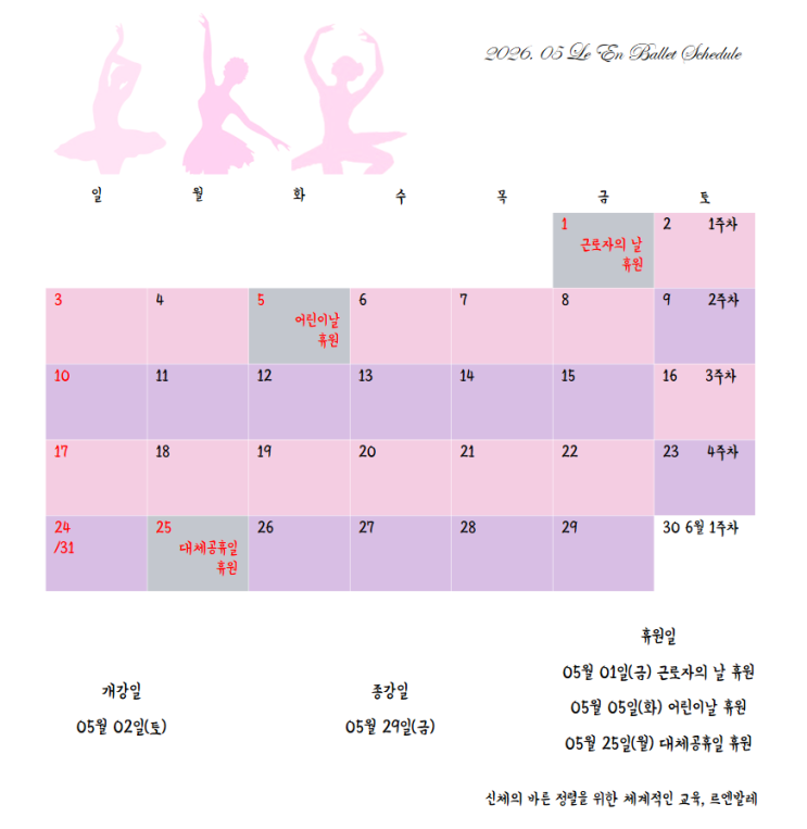 <개강일> 05월 02일 토요일 <종강일> 05월 29일 금요일 <휴원일> 05월 01일 금요일 근로자의 날 05월 05일 화요일 어린이날 05월 25일 월요일 대체공휴일 휴원 르엔 발레아카데미의 일정은 4주를 기본으로 진행합니다. 신체의 바른 정렬을 위한 체계적인 교육, 르엔발레 문의: 01063421298 / 카카오톡 ID: leenballet / 인스타그램 ID: le_en_ballet 경기 화성시 동탄대로시범길 148-58 피추프라자 3층 (방문상담 예약필수) <img src="https://blogthumb.pstatic.net/MjAyNjA0MTNfMjMx/MDAxNzc2MDU5MjIyNDcz.8PXEMx1VeX2ibM0poJVJB4lQzhiPa-36Ufox95agRe8g.0cTVtuxr7Zdj3XgRP_GGlN8uqIgyTZEoTtA5-DhfzEkg.PNG/image.png?type=s3" />