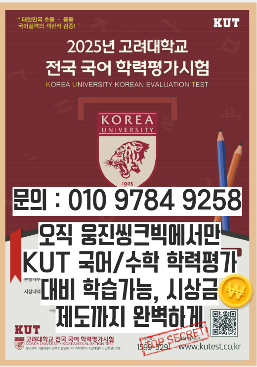 중학생이 되면 공부의 기준이 완전히 달라집니다. “열심히 했다”가 아니라 “결과로 증명해야 하는 단계” 그런데 많은 아이들이 여기서 막히기 시작합니다. ✔ 개념은 아는데 점수가 안 나오고 ✔ 문제는 풀었는데 시험에서 틀리고 ✔ 공부는 하는데 성적은 그대로 그래서 지금 필요한 건 단 하나입니다. “점수 나는 공부 + 객관적인 실력 검증” 웅진씽크빅 MASTER 특강 이 수업은 다릅니다. ✔ 개념 → 실전 문제까지 완벽 연결 ✔ 전략적인 문제풀이 훈련 ✔ 개인 수준별 맞춤 코칭 “알고 있는 공부”를 “맞히는 공부”로 바꿔줍니다. 그리고, 공신력있는 KUT 학력평가로 실력을 증명합니다 고려대....... <img src="https://blogthumb.pstatic.net/MjAyNjA0MTdfMTQw/MDAxNzc2Mzg2MDU1NTYw.wSYD2de8xMWZPMT9pjLdUbLvWscHPIMCAdXHUb-3J54g.iBSE0X0MKRnRnsQaH3Lq7tf8oQoqzJYBiAJZBzQVpSUg.PNG/image.png?type=s3" />