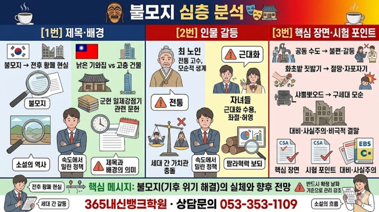 #2027수능특강 #불모지 #차범석 #현대희곡 #사실주의극 #구세대와신세대의갈등 #근대화의비극 #내신대비 #365내신뱅크학원 안녕하세요, 365내신뱅크학원입니다 오늘은 2027학년도 수능특강 문학 적용학습 극수필 02단원에 수록된 차범석의 불모지를 완벽하게 분석해 드립니다. 1950년대 전후 한국 사회의 황폐한 현실과 세대 간의 단절을 사실주의 기법으로 형상화한 이 작품의 핵심 포인트를 정리해 보겠습니다. 1. 제목 '불모지'와 무대 배경의 상징적 의미 작품의 제목과 시각적 배경은 주제 의식을 관통하는 가장 중요한 요소입니다. 제목 '불모지'의 의미: 식물이 자라지 못하는 거친 땅이라는 뜻으....... <img src="https://blogthumb.pstatic.net/MjAyNjA0MjNfOTMg/MDAxNzc2OTI0MDk5NDIx.8q0nc6JO6fU-VyY77nu2g8UHzMmM4MEoSdM6oYIncrog.p9MeJWNnt-SlMjB9jF-RvGNCNuPjJufHwIbLSLGwnIMg.JPEG/%BA%D2%B8%F0%C1%F6.jpg?type=s3" />