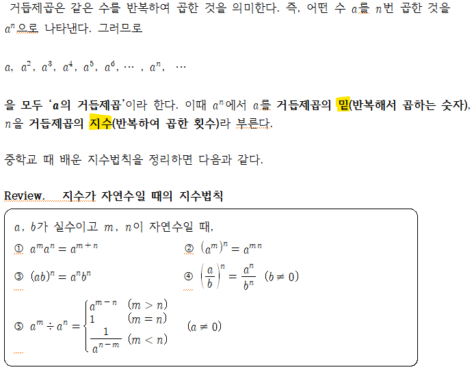 1-1. 거듭제곱 공식, 법칙, 성질 등을 공부할 때에는 ‘주어진 조건을 만족할 때 성립한다’는 것을 반드시 기억해야 한다. 대부분의 공식, 법칙, 성질은 특정 ‘조건’을 만족할 때 성립하는 것이기 때문에 그 조건을 확인하지 않고 법칙이나 성질을 적용하면 잘못된 결과를 얻을 수 있다. 위의 법칙은 지수가 자연수라는 조건을 전제로 성립한다. 항상 법칙을 이용할 때 문제에 주어진 ‘조건’을 정확히 파악해야 한다. 지수가 자연수일 때에는 밑 a,b가 실수이고, 지수가 정수일 때에는 밑 a,b가 0이 아닌 실수이지만 지수가 유리수가 되면 밑은 양수가 되어야 한다. 이는 중학교 때 제곱하여 음수가 되는 실수가 존재하지 않으므로 근호 안....... <img src="https://blogthumb.pstatic.net/MjAyNjA0MTVfMTA4/MDAxNzc2MjQ0MjcxNDUy.H7nPLFzONvUm7Ao2xWy-O-fepFKYHGZO8y-MrelOZ_0g.r-Px4y2VmUMXiIqMBqzgiDC190iWhgy-WWScn-dPXMMg.PNG/image.png?type=s3" />