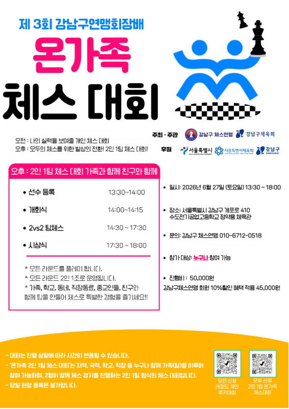 안녕하세요. 청라체스, 체스런입니다. 다가오는 6월, 아이들과 함께할 특별한 주말 계획을 찾고계시나요? 온가족이 함께 머리를 맞대고 즐거운 추억을 쌓을 수 있는 특별한 체스대회소식을 전해드립니다. 강남구체스연맹에서 주최하는 제3회 강남구체스연맹 회장배 온가족 체스대회입니다. 최근 두뇌 발달과 집중력 향상에 좋은 체스가 인기를 끌면서 어린이 체스대회를 찾으시는 학부모님들이 정말 많으신데요, 이번 강남체스대회는 일반적인 개인전이 아니라, 체스를 잘 모르는 초보자나 부모님도 아이와 함께 부담없이 참여할수 있는 가족체스대회로 진행되어 더욱 추천해드립니다. 제3회 강남체스대회(온가족 체스대회)요강 어린이체스대회 참....... <img src="https://blogthumb.pstatic.net/MjAyNjA0MjFfMjEz/MDAxNzc2NzM1MzE1Mjk2.o-2CKS9u8tgeug0ozOc12aRJUmsim0UE5FzyZ4zeiEgg.2aGBDhrvuLbrzosGO9RF9p4Pgzaigf4VxdRAPx1F-XQg.PNG/%B0%AD%B3%B2%B1%B8%C3%BC%BD%BA%B4%EB%C8%B8_20260627.PNG?type=s3" />