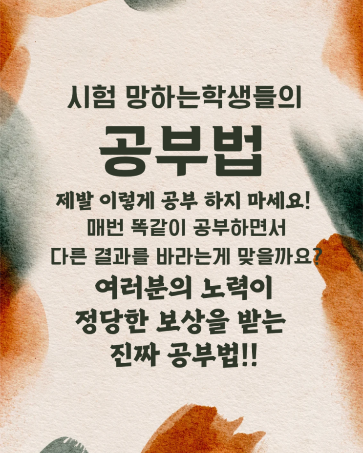 왜 매번 시험이 끝나면 후회는 하지만 왜 잘못된 습관을 고치지는 못할까요? 시험을 망치는 학생들은 모두 똑같은 방식으로 공부를 합니다. 매번 똑같이 하면서 다른 결과를 바라는게 맞을까요? 안녕하세요. 에이탑 학원 수진쌤입니다. 오늘은 매번 시험을 망쳤다고하면서 잘못된 습관을 계속 유지하는 학생들에게 시험을 망치는 습관에 대해서 알려주려고 합니다. 자신이 이런 습관을 유지하면서 좋은 점수는 바라고 있다면 이번에 자신의 공부 습관을 점검해 보는건 어떨까요? 1. 수업을 듣기만 하고 공부를 다 끝냈다고 생각합니다. 많은 학생이 학원이나 인강을 듣고 나면 묘한 뿌듯함을 느낍니다. 강사가 깔끔하게 정리해 주는 판서를 보며....... <img src="https://blogthumb.pstatic.net/MjAyNjA0MTlfODQg/MDAxNzc2NTk4MjEzNzQx.PhSuJJ0NZhTD0O4ZA-mK2elw-35Unq0K3CUegIZPo_og.rbtzD8dc7Lce7LQHH2ogASJaidphr_MnGlRmTQE6Siwg.PNG/900_%BD%C3%C7%E8_%B8%C1%C7%CF%B4%C2%C7%D0%BB%FD%B5%E9%C0%C7_20260419_202958_0000.png?type=s3" />