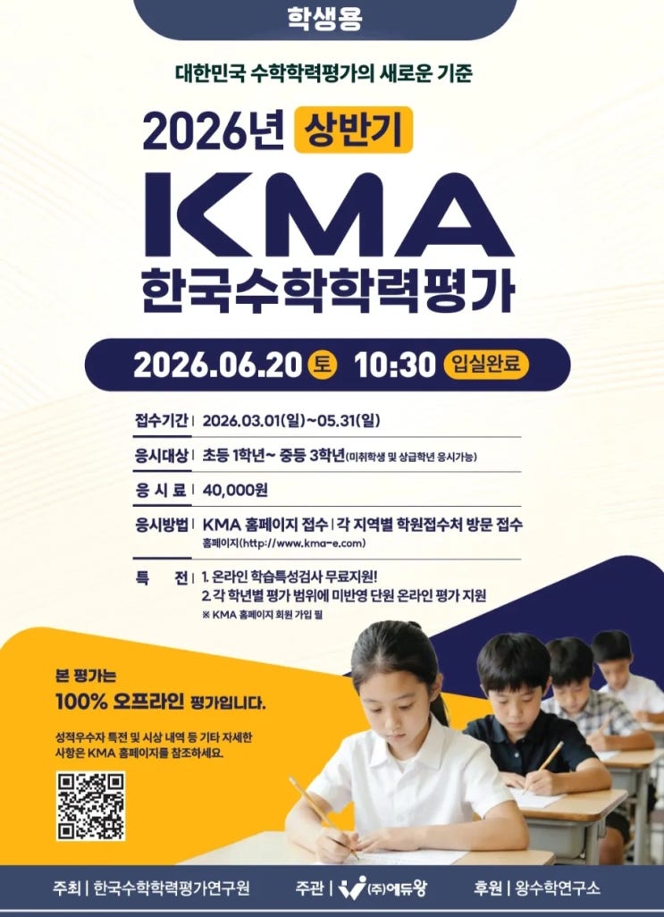 안녕하세요 초등수학 학력평가에는 여러가지가 있어요. 아이들이 다양한 수학학력평가를 경험해보면서 발전할 수 있도록 이번에는 KMA 한국수학평가에 도전해보려고 합니다. 항상 열심히 공부하는 유레카 친구들이 전국단위 시험을 준비하면서 숙제도 늘어나고 주말특강도 나와야하지만 시헝 후에 상장과 메달을 받으면 수학에 대한 자신감 커질거라 확신합니다. 유레카친구들 화이팅!! #종촌동수학 #종촌동수학학원 #종촌동사고력 #세종사고력 #세종씨투엠 #세종사고력수학 #세종가재마을수학 #가재마을초등수학 #가재마을유레카수학 #유레카수학 #유레카수학교습소 #씨투엠가맹 #씨투엠가맹비 #종촌동초등수학 #세종종촌동씨투엠 #가재마....... <img src="https://blogthumb.pstatic.net/MjAyNjA0MThfMjAg/MDAxNzc2NDk1OTM3ODg2.Ocps_hv0oyEvjGNGFxZ3mPUZF1nj66t3yWymCoEFufwg.BL_bE9E8bRpBIl73TJXSFaiRU7ZjGkLKf9CXGkKQR90g.JPEG/900_Screenshot_20260416_094452_Adobe_Acrobat.jpg?type=s3" />