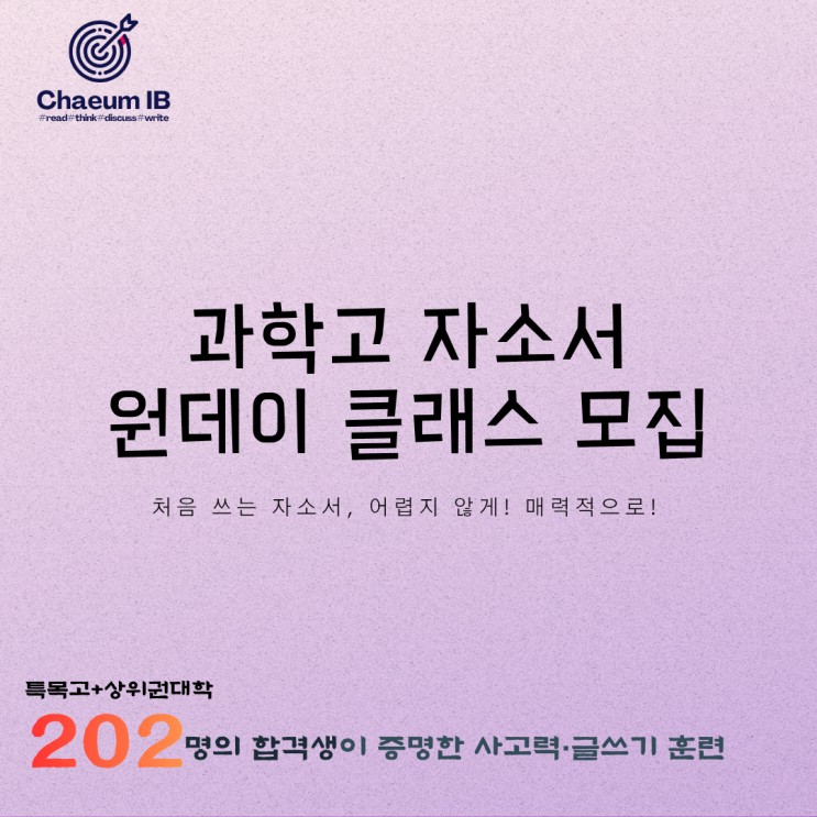 8월 과학고 자소서 마감이 다가오고 있습니다 자소서를 써야 한다는 것은 압니다. 그런데 막상 앉으면 막막합니다. "우리 아이 생기부에 쓸 만한 게 있을까." "어디서 어떻게 시작해야 하지." "초안을 써봤는데 이게 맞는 건지 모르겠다." 자소서는 혼자 쓰면 방향을 잃기 쉽습니다. 잘 쓰고 싶은 마음과 달리 결국 활동을 나열하는 글이 되거나, 선행 지식을 자랑하다가 면담에서 무너지는 자소서가 됩니다. 채움IB 과학고 자소서 원데이 클래스는 이 문제를 해결하기 위해 만들었습니다. 이 클래스에서 무슨 일이 일어나는가 첫째, 내 생기부에서 소재를 발굴합니다. "쓸 게 없다"고 느끼는 아이들의....... <img src="https://blogthumb.pstatic.net/MjAyNjA0MjNfMTcz/MDAxNzc2OTMwNTgwMzcx.R9mfaN31vO4ImkuBb_U2HMtLVv2DyeXb6KjFJZWEeKAg.HfeN0cz9l6_WK54dJRJFvhpzfkQ2GHiePXW2xU4lwvUg.PNG/%BA%ED%B7%CE%B1%D7_%C7%CF%B4%DC_%B0%F8%C5%EB.png?type=s3" />