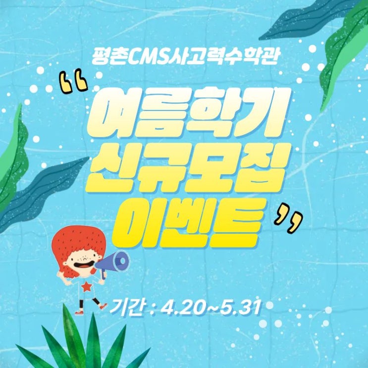 안녕하세요. CMS사고력수학관 평촌센터에서 여름학기 이벤트를 알차게 준비했습니다. 다양하고 특별한 혜택이 기다리고 있으니 많은 참여 바랄게요! 하나. 입학 시험 무료! CMS 사고력관은 아이의 잠재력을 깨우는 테마 기반 탐구 수업을 통해 이번 여름학기가 아이 인생에서 가장 의미 있는 성장의 계절이 되도록 함께 하겠습니다. ▼▽▼▽▼▽▼▽▼▽▼▽▼▽▼▽▼▽▼▽▼▽▼▽▼▽▼▽▼▽▼▽ 둘. 설명회 & 무료체험수업 참석자 전원 스타벅스 커피쿠폰 제공 설명회, 무료체험수업 참여만 해도 더위를 날려줄 아이스아메리카노가 공짜? ※ 6월 2주차 지급 선착순 마감(30명)이니 전화로 지금 예약하세요! ★설명회 및 무료체험수업....... <img src="https://blogthumb.pstatic.net/MjAyNjA0MTZfMjMx/MDAxNzc2MzExMDAyMDIy.K_WJccQIbGXAUo0xj_vpwZptjCKxF1BFKahKLUAAZoEg.ZfLJph9P5lejUJpY_tIeSm2rQYur2gzjUp3Uzfu5_wUg.JPEG/%BF%A9%B8%A7%C7%D0%B1%E2_%C0%CC%BA%A5%C6%AE-%BC%B6%B3%D7%C0%CF.jpg?type=s3" />