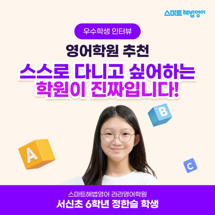 영어학원추천, 스스로 다니고 싶어 하는 학원이 진짜입니다! 초등학교 6학년 정한슬학생은 학원 개원 초기부터 지금까지 꾸준히 영어를 배우고 있는 학생입니다. 여러 학원을 동시에 다니며 힘들었던 시기에도 영어학원만큼은 계속 다니고 싶다고 말할 정도로 영어 공부에 대한 애정이 남다른 학생인데요. 아이가 먼저 가고 싶어 하는 학원이라면, 그것만으로도 충분히 영어학원추천 이유가 됩니다. 종이교재가 스마트러닝 학습으로, 영어를 좋아하게 만드는 즐거운 학습 환경 한슬이는 영어를 가장 좋아하는 과목으로 꼽습니다. 지금은 초등학생이지만 중등 레벨의 영어를 공부할 만큼 실력도 탄탄한데요. 그 비결로 꾸준한 예습과 즐거운 학습....... <img src="https://blogthumb.pstatic.net/MjAyNjA0MjJfNzQg/MDAxNzc2ODMxMDk0OTUw.BsswcBYDMDAkqXBrTAy7YBQ3oIqfRpipYs6ZVxNDgYAg.KPUi3dyy5af21Q1N84TOuA8og5OqdT5MZOdkTWYI0Gog.JPEG/260121_%BD%BA%B8%B6%C6%AE%C7%D8%B9%FD%BF%B5%BE%EE%BF%EC%BC%F6%C7%D0%BB%FD_01%28%BA%ED%B7%CE%B1%D7%29.jpg?type=s3" />