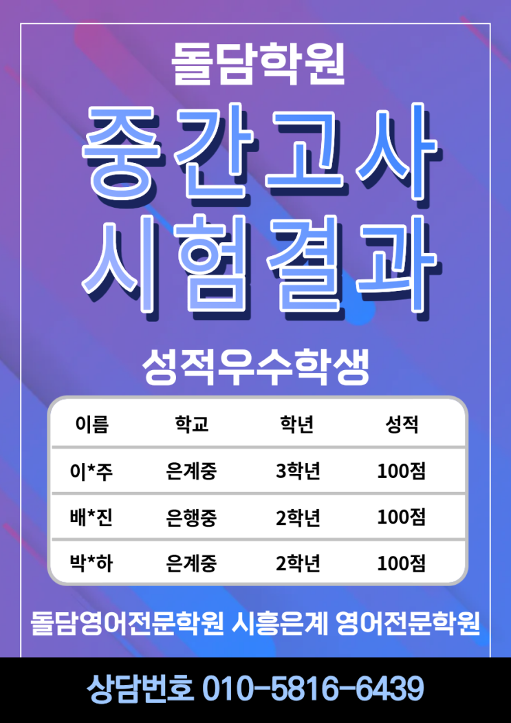 7명의 중등 재원생 중 3명 만점~ 나머지 4명의 학생도 의미있는 성적향상이 있도록 앞으로도 최선을 다해 지도하겠습니다! 상담전화 010-5816-6439 <img src="https://blogthumb.pstatic.net/MjAyNjA0MjlfMTg3/MDAxNzc3NDcwNzkxMDUw.A42_zN5j6kkk3bR8l08exOk067TIPcx6NjctonJUyvwg.cpsRZejwLB0RFGDTU4TTHwMTfkyMnWSZPpqD4UShMbwg.PNG/%BC%BA%C0%FB%BF%EC%BC%F6%BB%FD.png?type=s3" />