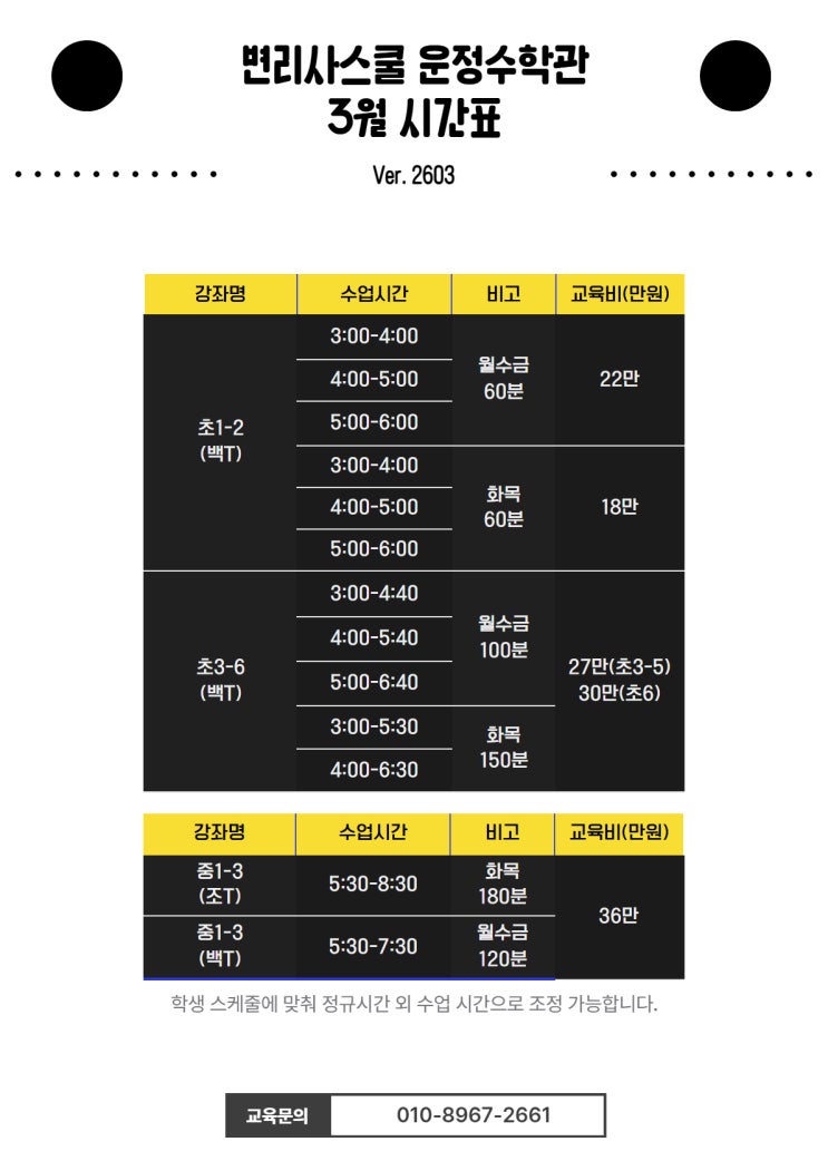 [변리사스쿨 운정수학관] 파주 운정 수학학원, 3월 시간표