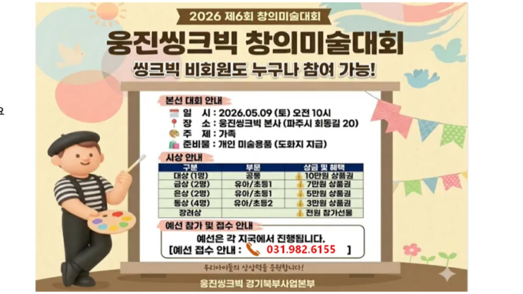 2026 제6회 웅진씽크빅 창의미술대회 안내 아이들의 상상력을 마음껏 펼칠 수 있는 특별한 기회! 2026 제6회 창의미술대회가 드디어 개최됩니다 이번 대회는 씽크빅 회원이 아니어도 누구나 참여 가능해서 더 많은 아이들이 함께할 수 있어요! 본선 대회 일정 - 일시: 2026년 5월 9일(토) 오전 10시 - 장소: 파주 웅진씽크빅 본사 - 주제: 가족 - 준비물: 개인 미술용품 (도화지는 현장 제공) 시상 안내 - 대상(1명): 10만원 상품권 - 금상(2명): 7만원 상품권 - 은상(2명): 5만원 상품권 - 동상(4명): 3만원 상품권 - 장려상: 참가자 전원 선물 예선 안내 예선은 각 지국에서 진행되며, 접수를 통해 참여하....... <img src="https://blogthumb.pstatic.net/MjAyNjA0MTNfMTQx/MDAxNzc2MDU4OTg4MDIz.HAEuneaiNHoYqJePmwjVy3PPloCMNa8d4dzeN_oDaWgg.CWgrQu5tnhGSSu91P7ikuaD-nSUfzxOnrnrxvMG3EKsg.PNG/900_1776058768926.png?type=s3" />