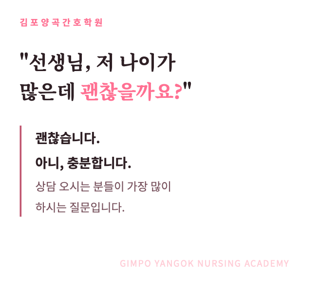 안녕하세요, 김포양곡간호학원 입니다. 오늘은 상담을 오시는 분들이 가장 많이 하시는 질문 중 하나를 주제로 글을 써보려 합니다. "선생님, 저 나이가 많은데 괜찮을까요?" 이 질문, 정말 자주 듣습니다. 그리고 매번 같은 말씀을 드립니다. "괜찮습니다. 아니, 충분합니다." 왜 50대가 늦지 않았다고 생각하는가 우리는 지금 100세 시대를 살고 있습니다. 50대면 앞으로 수십 년을 더 살아야 합니다. 그 시간을 어떻게 채울 것인가, 이게 지금 50대 분들이 진짜 고민해야 할 질문이라고 저는 생각합니다. 방향성만 잘 잡으면 50대는 오히려 새로운 안정을 만들 수 있는 시기입니다. 간호조무사 자격증은 그 방향 중 하나....... <img src="https://blogthumb.pstatic.net/MjAyNjA0MTZfMTU4/MDAxNzc2MzIxNzExMTA2.nBXP2lwHc-a3sQzHeavL4vVwuLrE6Sui-w6d3guJwQwg.9og2esACuUHkrUmcRfotFq-xAb17piPS6SIW-J-CoyIg.PNG/%BD%BA%C5%A9%B8%B0%BC%A6_2026-04-16_%BF%C0%C8%C4_3.40.15.png?type=s3" />